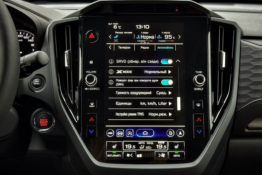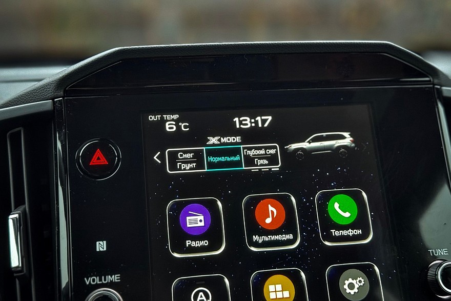 Помнится, в «леснике» прежнего поколения на центральном тоннеле была удобная шайба системы выбора режимов движения X-Mode, но теперь её нет, и выбирать пресеты «Нормальный», «Снег/Грунт» и «Глубокий снег/Грязь» можно только через тачскрин, как на модели Crosstrek. Алгоритмы работы трансмиссии понятны и, в общем-то, типичны: «Снег/Грунт» предназначен для скользкого покрытия, в том числе — асфальта.