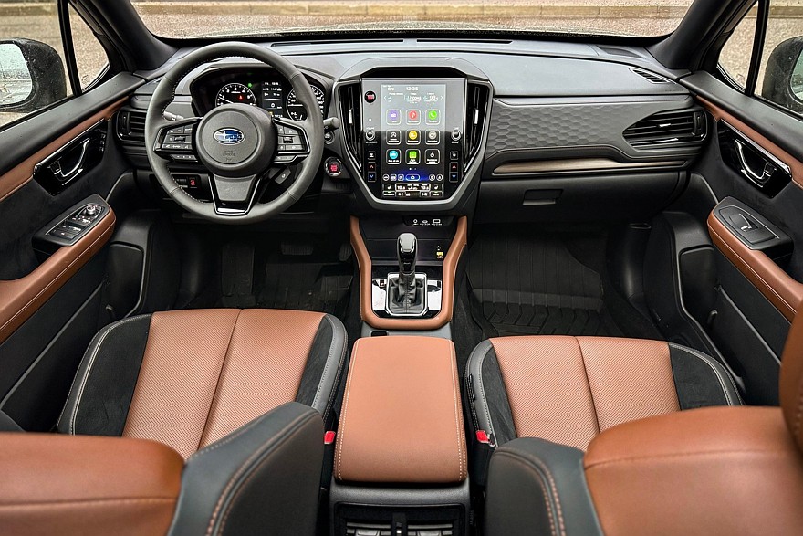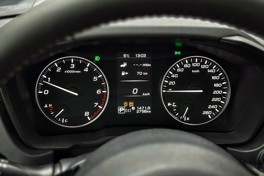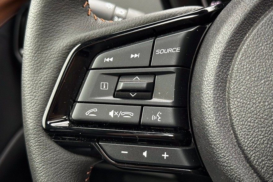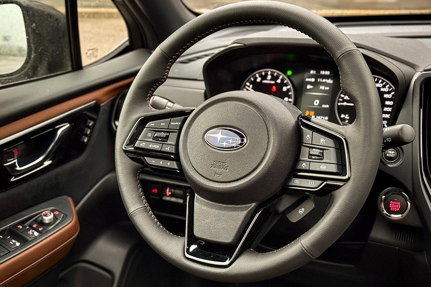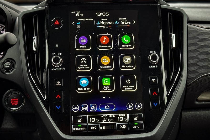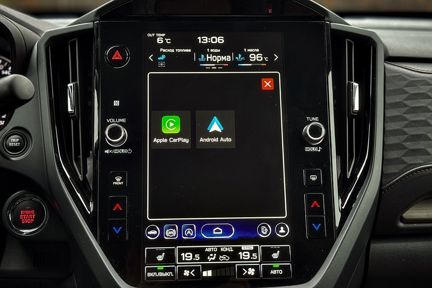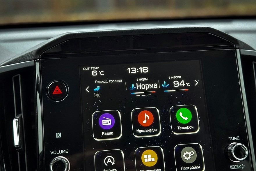 Никакой пёстрой графики, никакой визуальной суеты – только чёткие цифры и ясные стрелки. Всё просто и понятно, как компас. Да-да, тот самый компас, который не нужно заряжать или обновлять. Типично субаровский руль удобен, но кнопок на спицах многовато и расположены они не очень логично. Отдельная клавиша подогрева (обод греется, кстати, лишь в местах хвата) между спицами выглядит немного комично. 11,6-дюймовый тачскрин мультимедийной системы тоже типичен для Subaru.