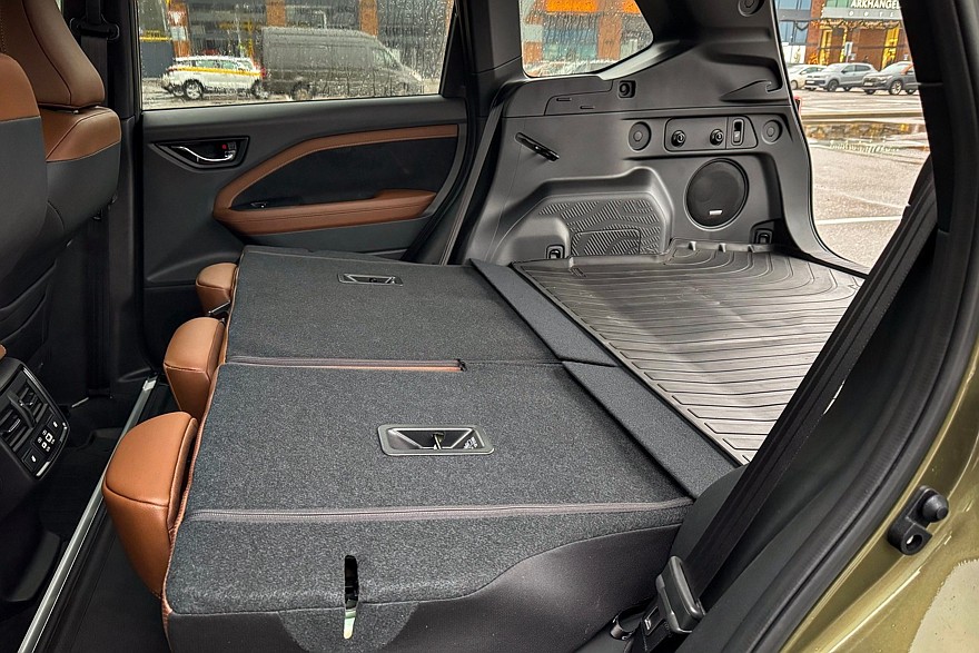 В 504-литровом багажнике есть почти всё: ровный пол, кармашек, крючки, петли, рулонная шторка, кнопки складывания спинок, сабвуфер, инструменты и полноразмерная запаска под полом. Нет только плафона освещения – искать вещи в темноте очень неудобно. Чувствуешь себя археологом, который копает в абсолютной темноте. К слову, темновато здесь не только в багажном, но и в пассажирском отсеке: контурной подсветки тоже нет. Да, не быть интерьеру Forester звездой соцсетей…