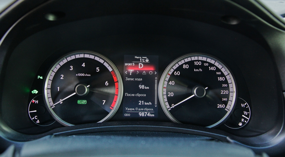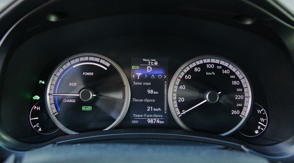 Оборудованная электроподъемником задняя дверь медленно поползла вверх, открывая недра багажного отделения. 500 литров — неплохой показатель, позволяющий каждому из пассажиров прихватить в путешествие по чемодану средних размеров. В моем случае багажник легко проглотил детский снегокат. Но на этом его возможности не исчерпаны. Спинки заднего ряда укладываются, образуя ровный с багажным пол. Впрочем, справедливости ради стоит отметить, что небольшой уклон при этом все же присутствует. Ну да черт с ним. Главное — пол без ступенек, что позволяет без труда укладывать в NX300h габаритные грузы. Кнопка "Пуск" — на старт! "Эн икс" молчит. Неподготовленный водитель, пожалуй, поседеет прежде, чем поймет, что гибридный автомобиль уже заведен и все его системы в полной боевой готовности. Об этом, кстати, сообщает неприметная надпись Ready на приборной панели. Но первые мысли привыкшего к рыку моторов человека, уверен, будут о неисправности. Впрочем, к этому тоже надо привыкнуть. Лично я перестал бояться тишины через пару дней.