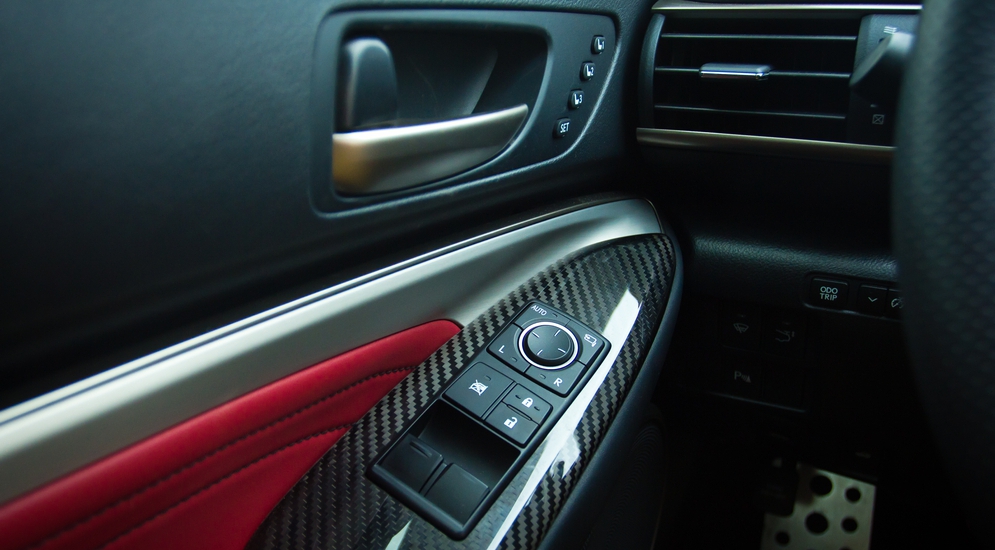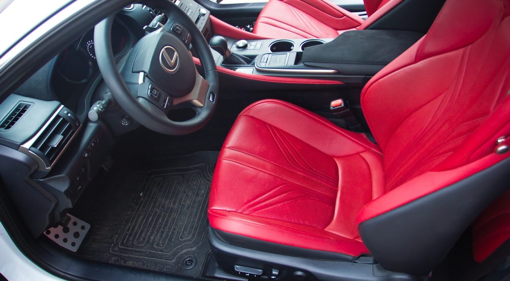 В салоне так же ярко и контрастно: комбинация из пластика, карбона и ярко-красной кожи. На центральной консоли часы, характерные для современных моделей Lexus, дисплей с навигацией и повсюду шильдики с буквой «F»... И это все, за что цепляется глаз.