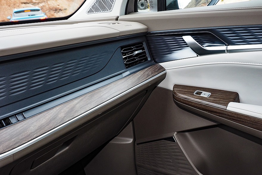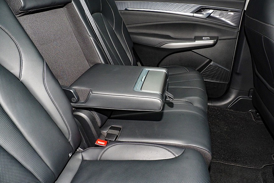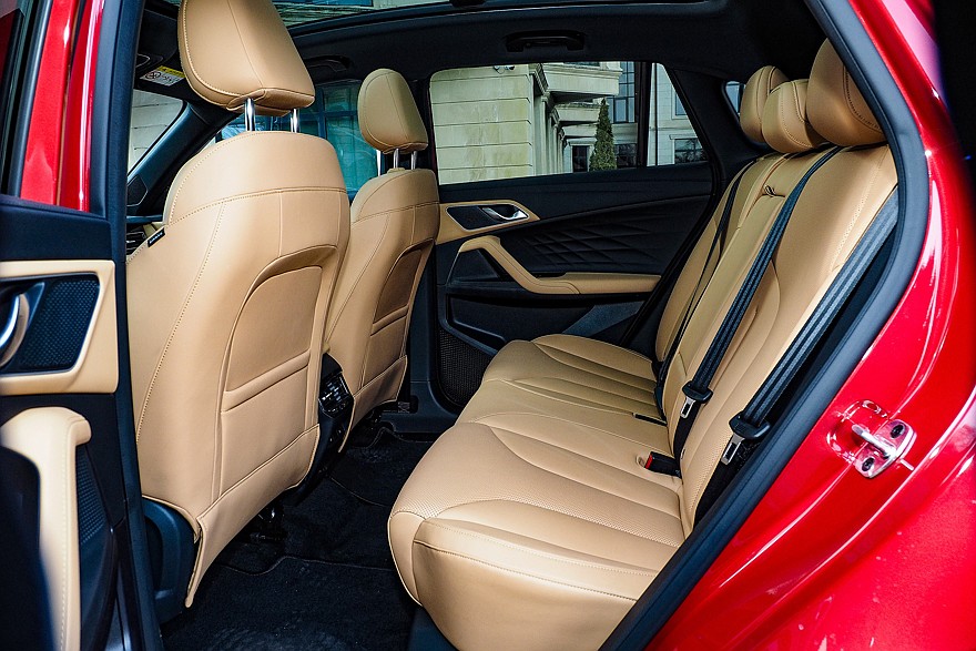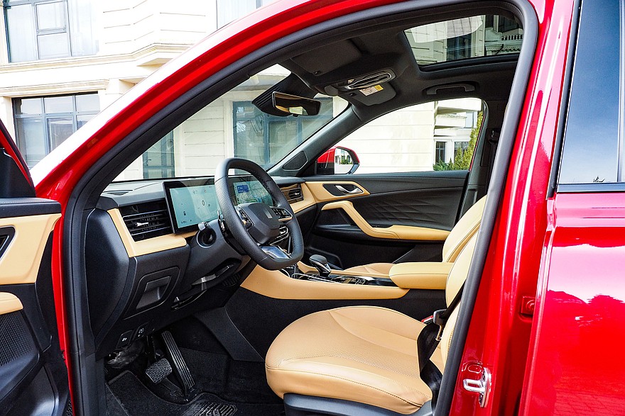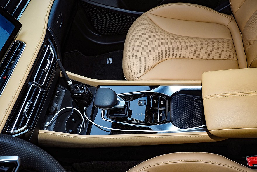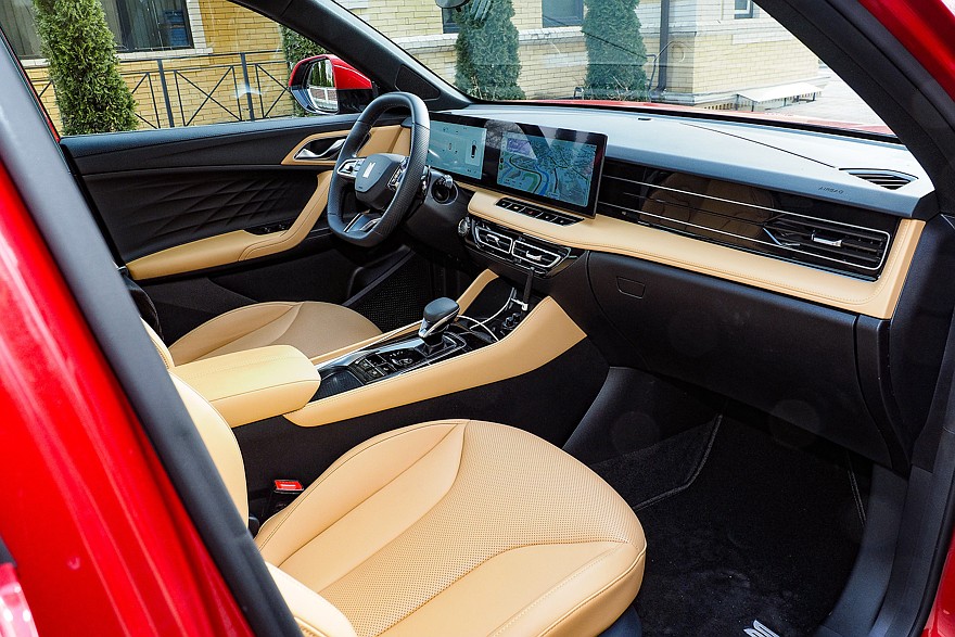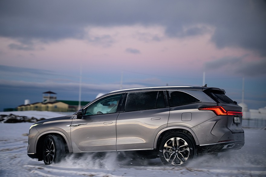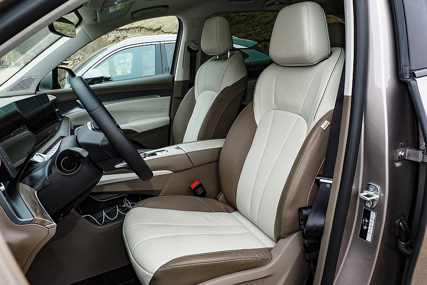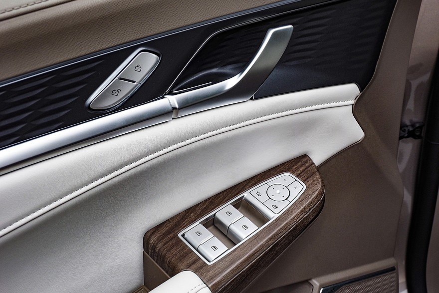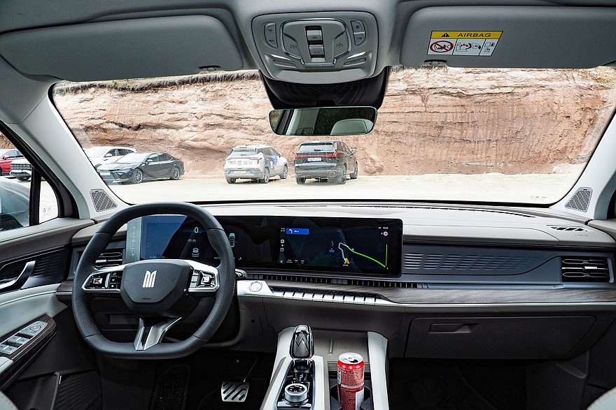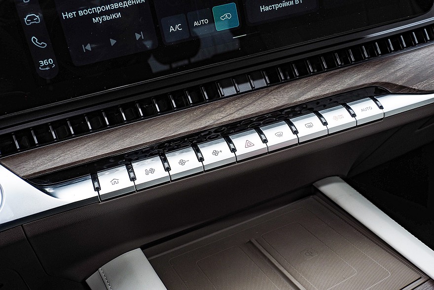 Ну а теперь пора поближе познакомиться с новым флагманом. В интерьере кроссовера есть множество элементов, общих с М70: руль, спарка из двух 12,3-дюймовых экранов, передние кресла практически такой же формы. Но и отличия тоже видны сразу. Во-первых, тачскрин медиасистемы повернут на небольшой угол в сторону водителя, а значит, будет меньше бликовать. Кресла обтянуты явно более качественной и дорогой перфорированной кожей и имеют больший диапазон перемещения. Вместо жестких пластиковых панелей – детали под брашированное дерево, есть атмосферная подсветка, а на закрывающих динамики акустической системы решетках красуется логотип Bose. Металлические накладки на педали по идее должны намекать на некую спортивность, но это именно намеки: по динамическим показателям М90 никоим образом не может претендовать на лидирующие позиции даже в рамках сегмента. Разгон до сотни у этой модели занимает 10,9 секунды, то есть на секунду больше, чем в случае М70 с 1,5-литровым мотором.