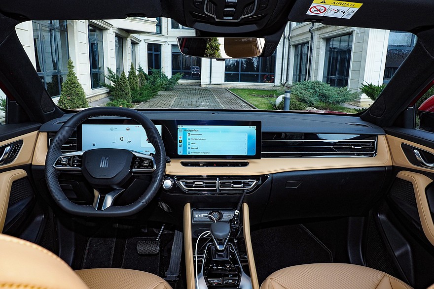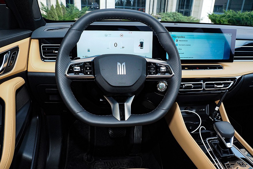 Вообще, к эргономике М70 у меня не возникло каких-либо серьезных нареканий: удобное положение за рулем я нашел без всяких проблем, при этом мне не пришлось выбирать до конца диапазон продольного перемещения кресла. Всю нужную информацию водитель считывает с двух 12,3-дюймовых дисплеев, объединенных в единый блок. При этом практически все главные функции доступны не только через тачскрин медиасистемы, но и снабжены физическими органами управления. А если какой-то важной для вас функции такой отдельной кнопки или клавиши не досталось, на спицах руля есть кнопки со звездочками, и, воспользовавшись меню, можно повесить эту функцию на такую кнопку. А еще меня порадовало наличие кнопки с изображением домика. Эта кнопка «Домой» очень облегчает переключение между режимом сопряжения медиасистемы со смартфоном и режимом экранного меню и обратно.