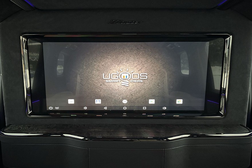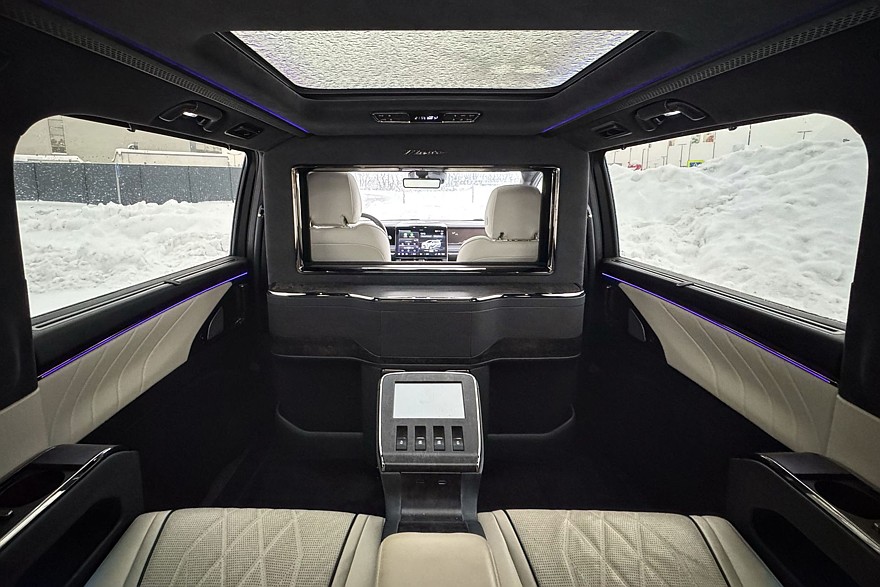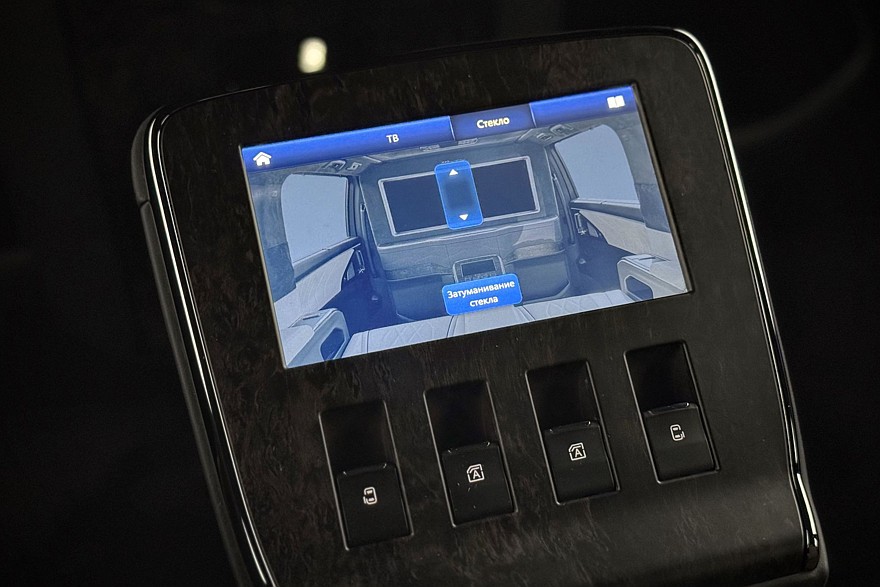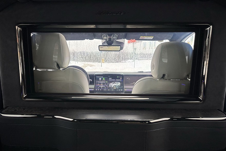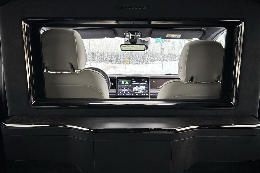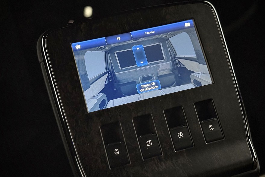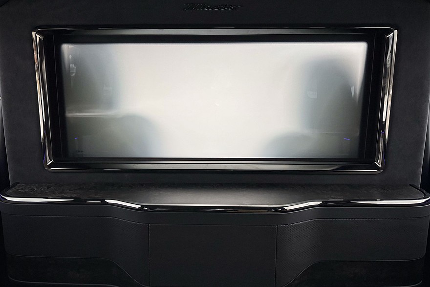 Но едва ли владельца M8 Lounge будут беспокоить проблемы наёмных водителей. Ведь от недовольного шофёра можно отгородиться двумя способами на выбор: стеклом или даже телевизором – в перегородке есть и то, и другое. Социальная дистанция, возведённая в абсолют. Стекло вдобавок электрохромное – нажатием виртуальной кнопки его можно мгновенно сделать непрозрачным. Нажав и подержав (в целях безопасности, гласит инструкция) другую кнопку, можно поднять из недр перегородки 34-дюймовый телевизор.