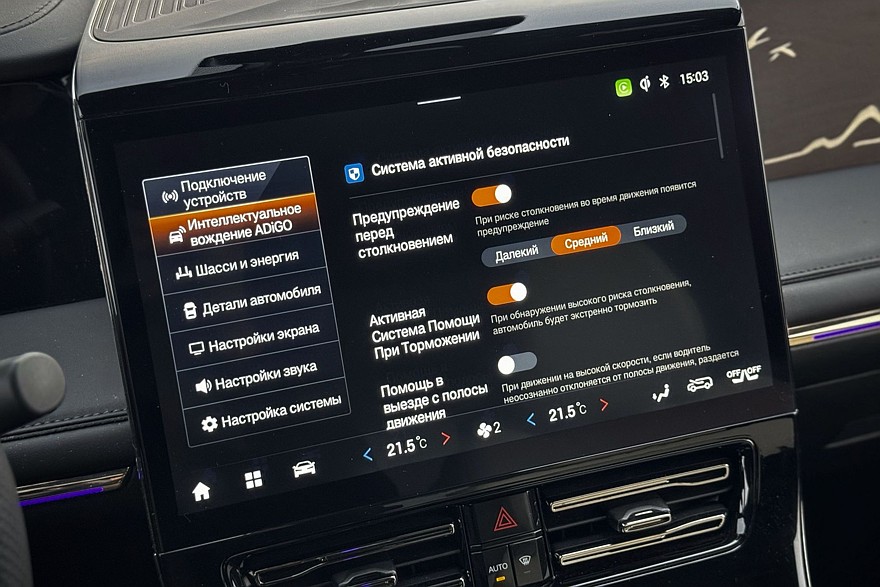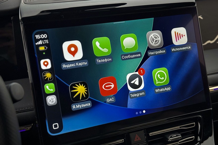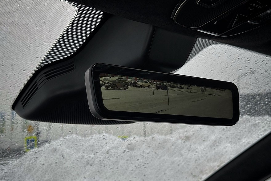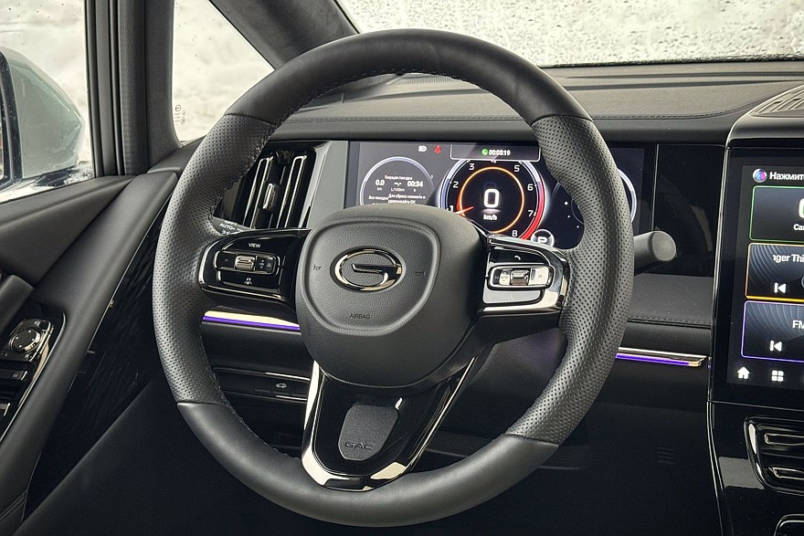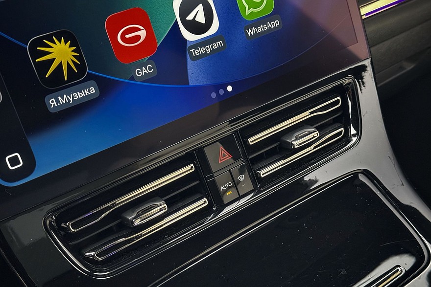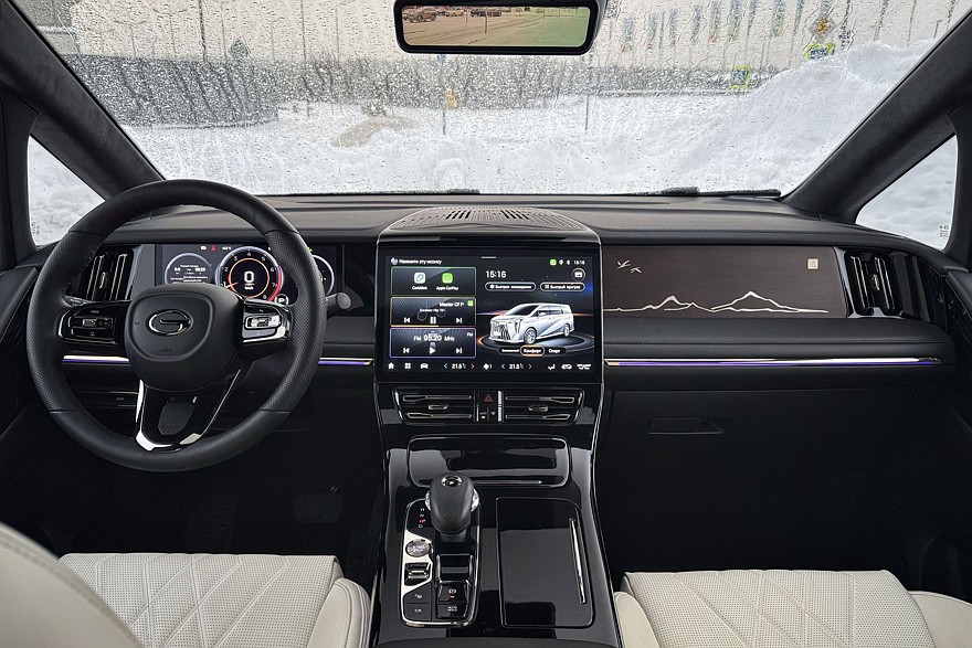 Про мультимедийную систему GAC и перлы перевода на русский мы уже много раз рассказывали, повторяться не будем. Здесь всё ровно то же самое. Но радует, что, в отличие от чёрной машины в исполнении GX Premium, здесь беспроводной Apple CarPlay не отваливался ни разу. Видимо, в GAC обновили прошивку. Ещё одно отличие версии Lounge – салонное зеркало в виде экрана, транслирующего картинку с камеры под козырьком багажной двери. Изображение в небольших пределах можно отрегулировать по яркости, контрастности и даже углу обзора.