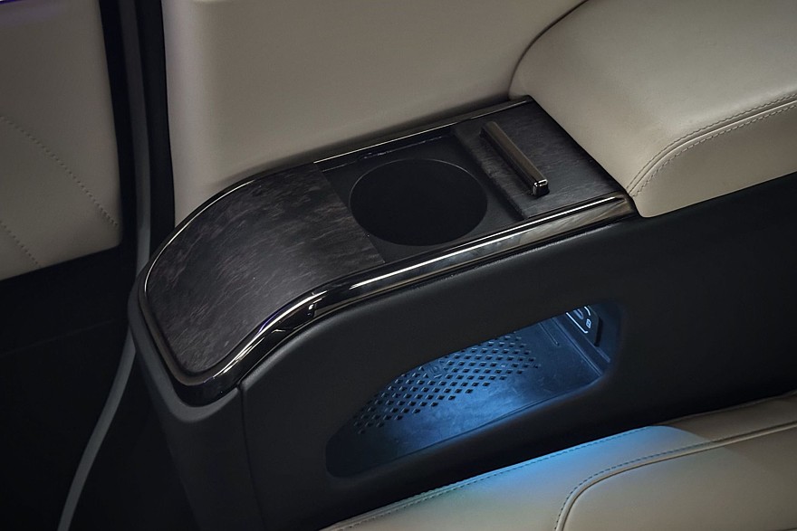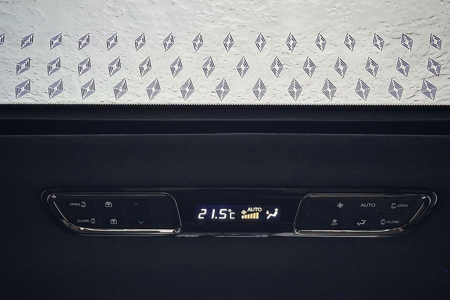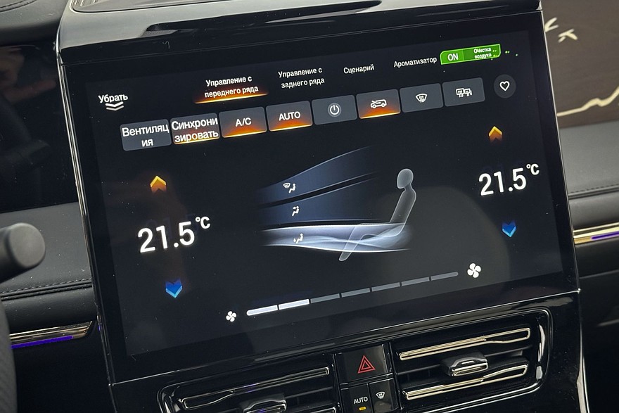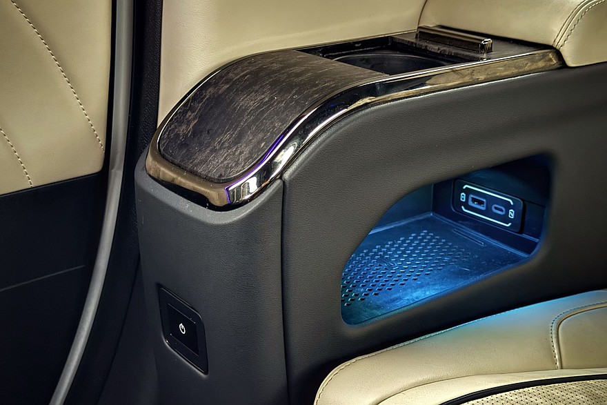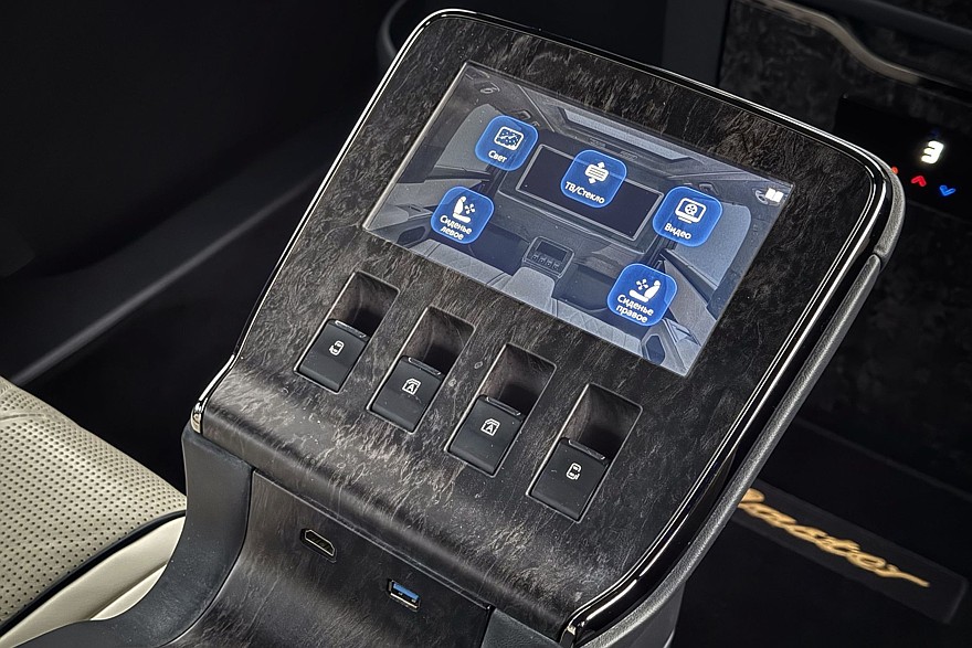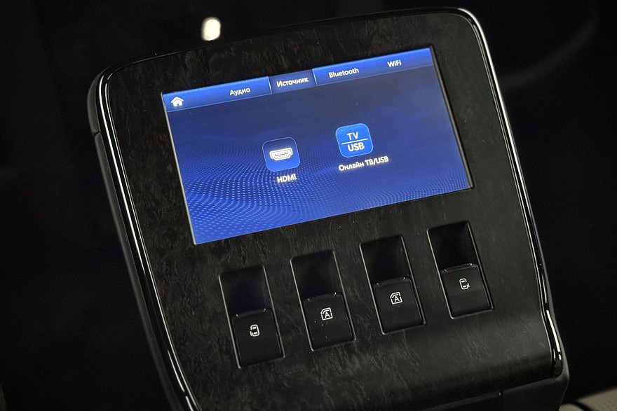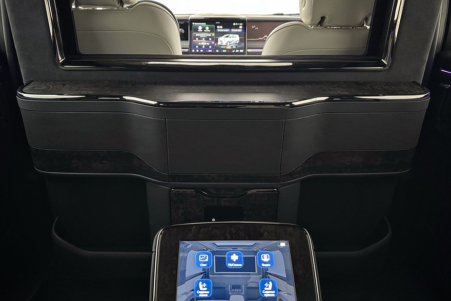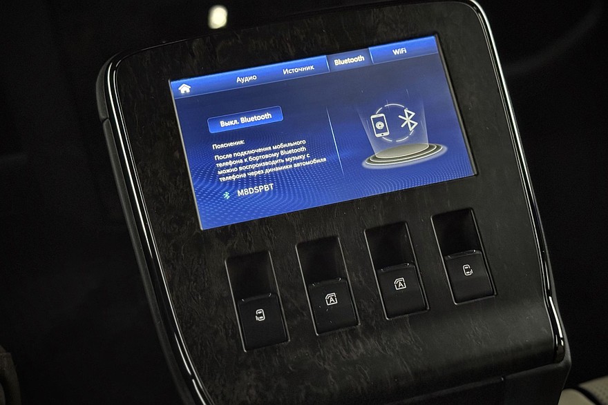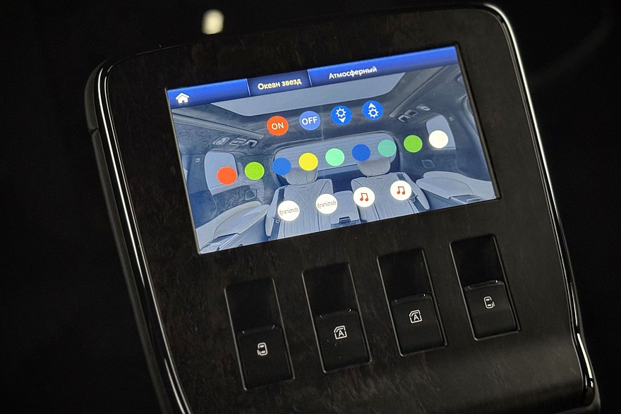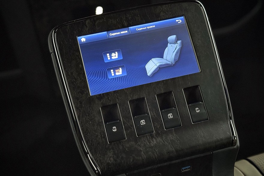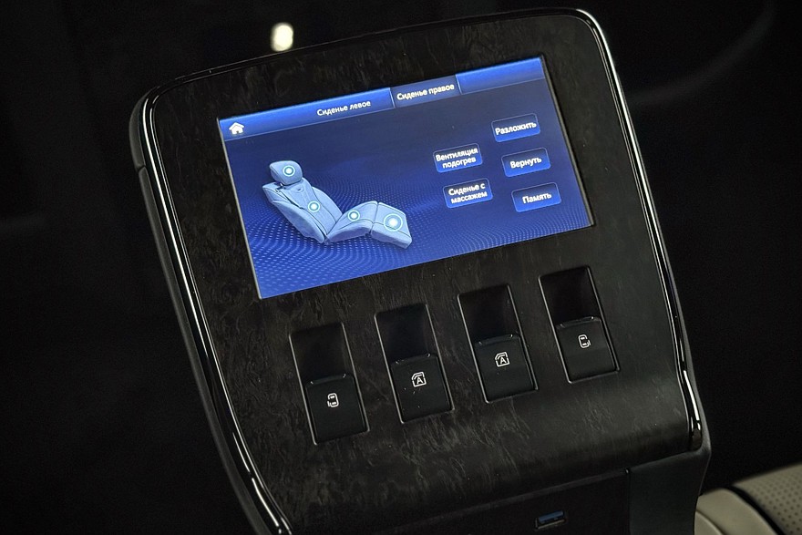 Благо всем хозяйством, кроме климата, можно управлять с помощью тачскрина между креслами – опускать и поднимать стекло перегородки или телевизор, выбирать источник изображения, включать контурную подсветку или разноцветное «звёздное небо» в потолке. И бог с ним, что массаж (с интригующим режимом «Возврат поясницы») можно включить только через сенсорный экранчик. Куда хуже, что и отрегулировать кресла можно только виртуальными кнопками – аналоговых клавиш здесь просто нет, словно их отправили на пенсию. А чтобы включить дисплей, нужно сначала найти и нажать кнопку… в торце кресла, со стороны двери.
