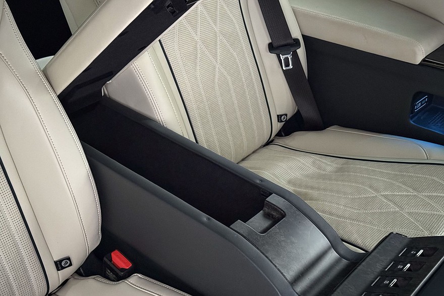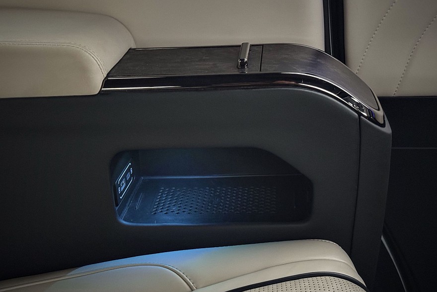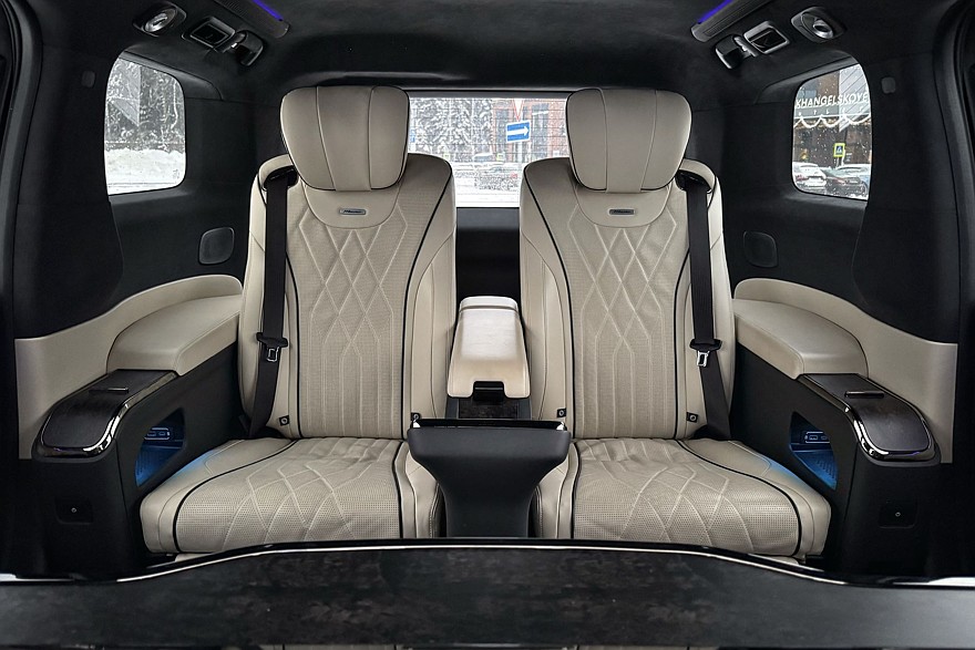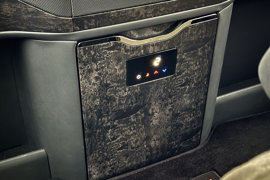 Зато места сзади – с избытком. Настолько, что кажется, будто салон растянули в Photoshop. Оба кресла одинаковы в плане функционала – у них есть подогрев, вентиляция и несколько программ массажа, оба сиденья можно разложить в горизонталь или хотя бы выдвинуть оттоманку, чтобы вытянуть ноги. И даже в этом случае обувь не дотянется до перегородки. Руки, впрочем, тоже: чтобы настроить климат с помощью потолочной консоли или взять что-то из холодильника, приходится отстёгивать коротковатый ремень безопасности.