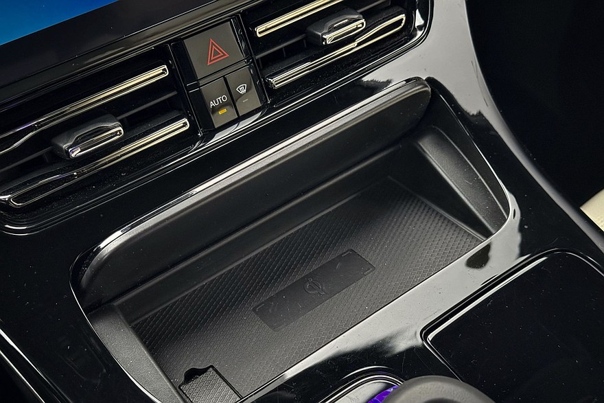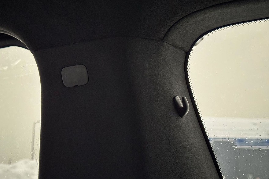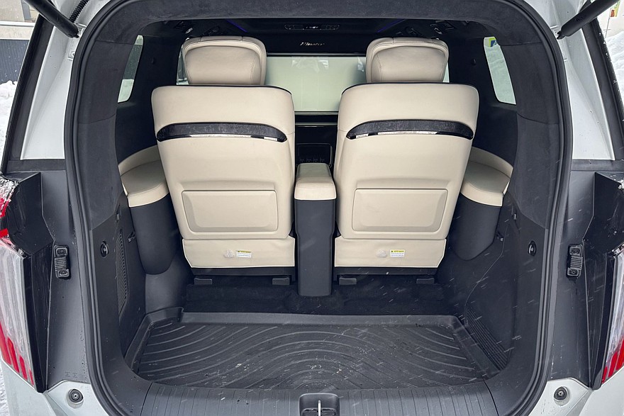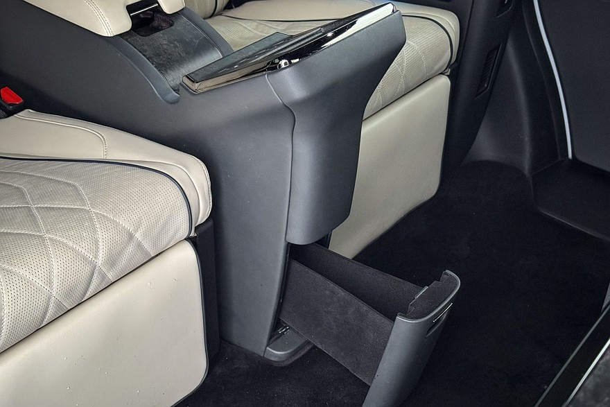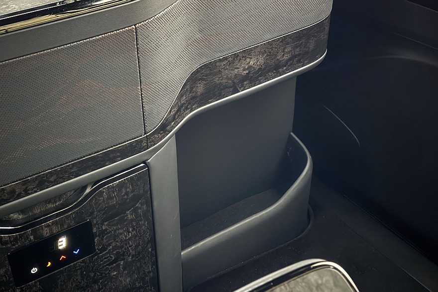 Телевизор, кстати, и беспроводные зарядки по бокам от сидений включаются так же. В нишах с зарядками также есть разъёмы USB обоих форматов. Между креслами, в подлокотнике, есть небольшой отсек для мелочей – туда как раз помещается пульт от экрана в перегородке, а под ним, в ногах – ещё более узкий выдвижной ящик. Туда можно положить разве что планшет. Крючки на потолке посередине сдвижных дверей расположены неудачно – куртка загораживает дверное окно. Есть крючки и на задних глухих окнах, что ещё более неудобно: тогда одежда закрывает обзор по бокам и вдобавок сильно мнётся.