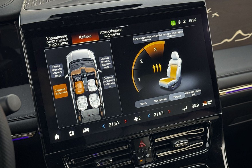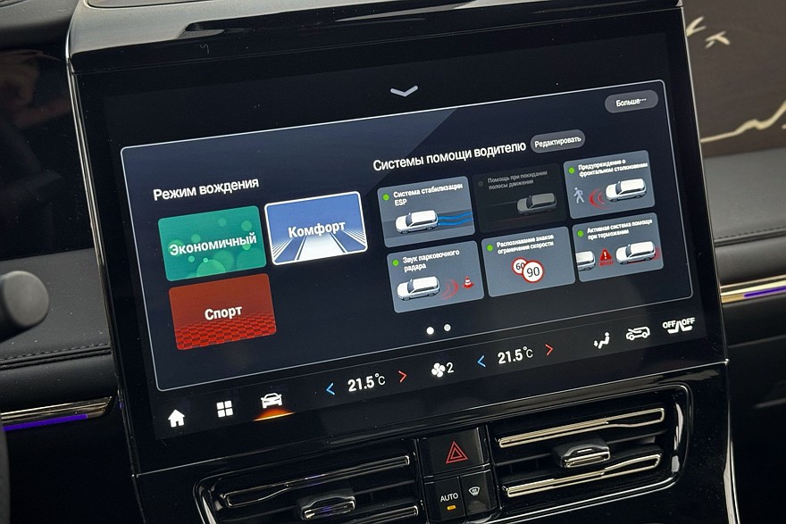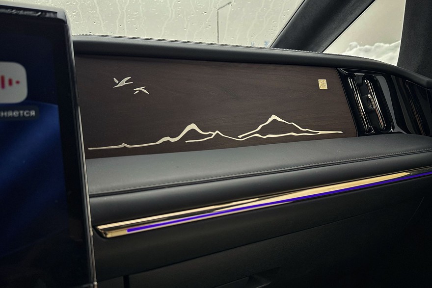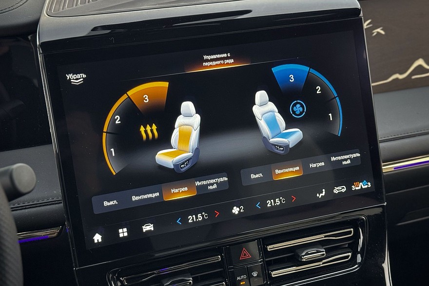 Разумеется, те же ограничения распространяются и на переднего пассажира. Или охранника? В общем, человеку справа от водителя тоже придётся забыть о вальяжной посадке. Зато он может полюбоваться на красивую поделку: передняя панель здесь украшена деревяшкой с металлической инкрустацией в виде стилизованного силуэта горного хребта и пары птичек. В целом же кресла удобны, а диапазоны регулировки руля по сравнению с другими китайскими автомобилями так вообще просто праздник какой-то. Обидно только, что массажем передние сиденья обделены – есть лишь подогрев и вентиляция.