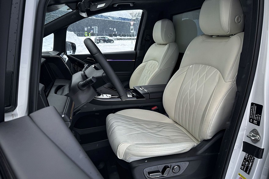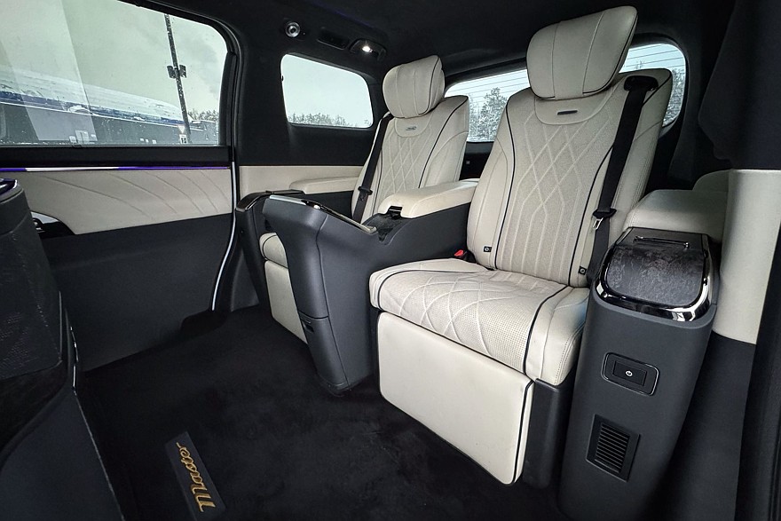 Тестовый М8 затянут в белую и чёрную кожу, а потолок и стойки крыши – в чёрную алькантару. Почти классический набор «дорого, богато, без сюрпризов». Передняя часть 4-местного салона ничем не отличается от 7-местного исполнения, кроме массивной перегородки, но это неизбежно вносит коррективы в компоновку интерьера. Главное – шофёр в Lounge не должен быть выше 180 см. Судя по моему росту, это разумный предел для более-менее правильной посадки, да и то спинку пришлось отрегулировать чуть более вертикально, чтобы она физически не упиралась в перегородку – иначе при езде в кресло передаются лишние вибрации.