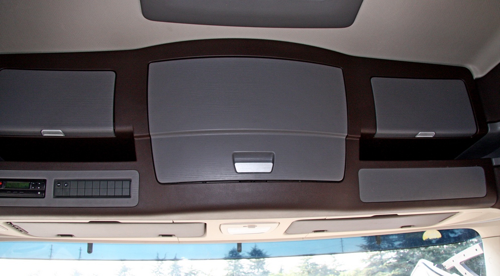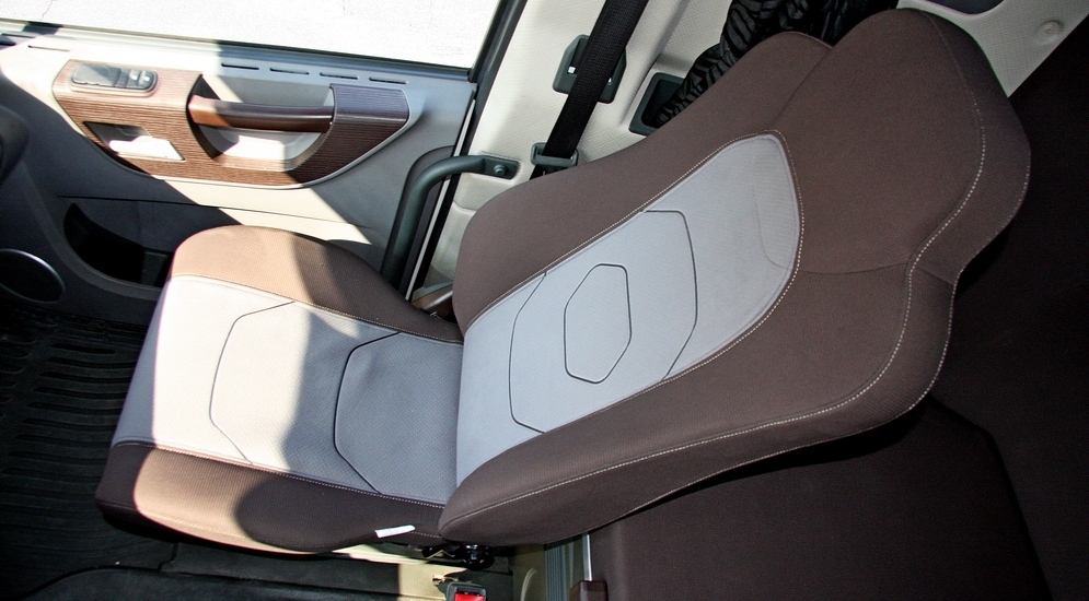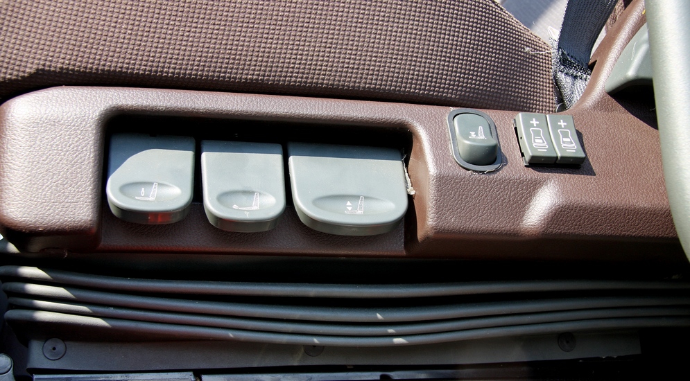 Опускаем кабину и забираемся внутрь. Прощупываем, постукиваем, принюхиваемся – и снова не к чему придраться, нормальный (хотя и жестковатый) пластик, нормально подогнанные детали, на месте саморезы – ничего не скрипит и не отваливается. Руль регулируется в двух плоскостях, сиденье с семью регулировками, пневмоподвеской и встроенным ремнем безопасности. Запаса регулировок хватает всем, и это не может не радовать. В моей жизни, лет 10 назад, уже был случай, когда я был вынужден отказаться от тест-драйва китайского развозного фургона по самой банальной причине – я в нем просто не помещался.