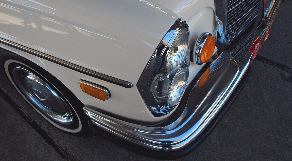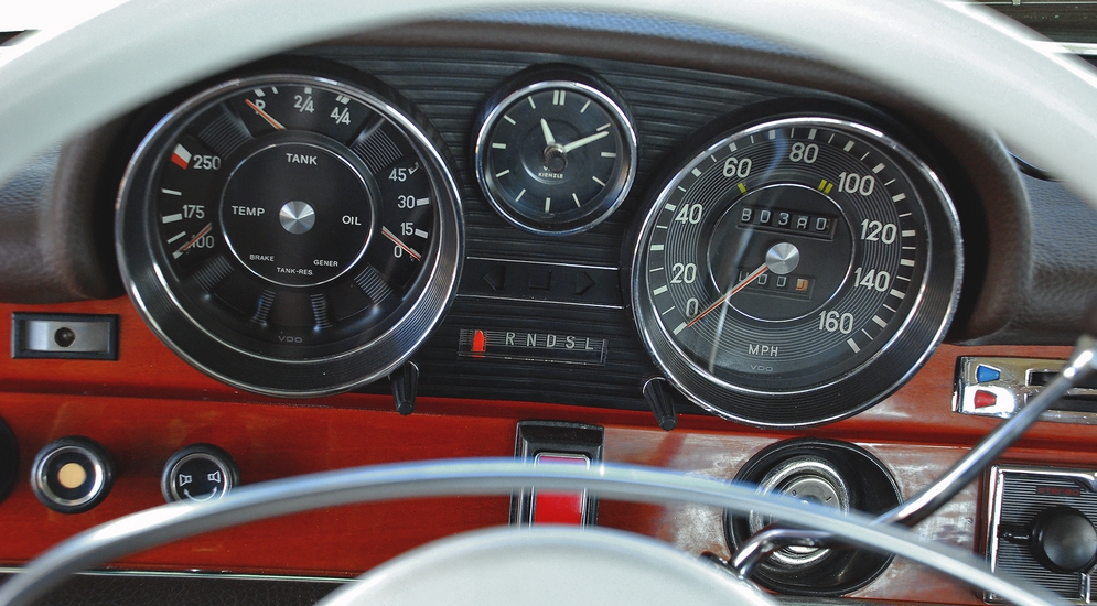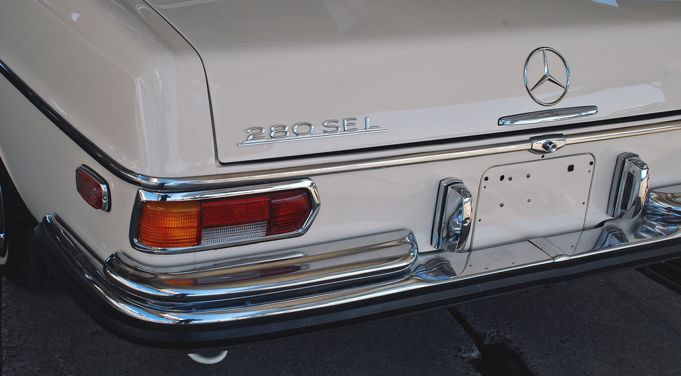В наших руках поздняя машина 1972 года – уже через год поколение сменит следующий S-класс в кузове W116. С первого взгляда ясно, что машина предназначалась для рынка Северной Америки. Версию для США и Канады можно отличить по дополнительным габаритным огням и катафотам на боковинах кузова, а также по селектору автоматической трансмиссии, прописавшемуся на рулевой колонке, – европейские машины имели селектор в более привычном месте, между креслами.