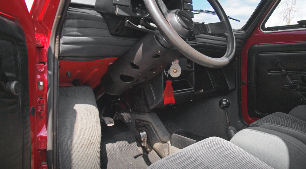 Видимо, именно поэтому салон выполнен в духе минимализма. Плоские дверные панели, практически отсутствующая «торпеда» – по сути, перед водителем есть лишь комбинация приборов, а голый металл прикрыт компактной накладкой. Еще обращают на себя внимание поворотные форточки – точно такие же, как на забытых уже Жигулях первых моделей.