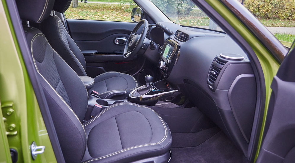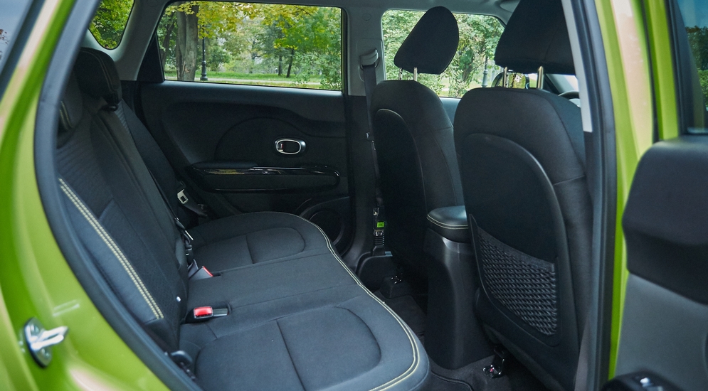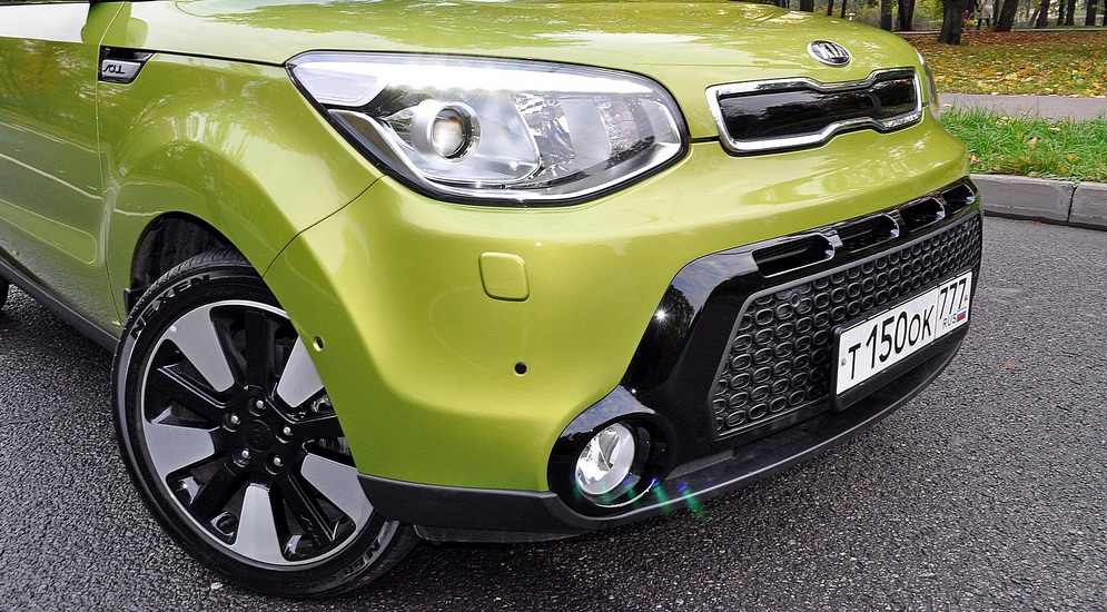 В остальном – все то же самое, только зеленое. Комплектация тестовой машины – топовая, с шикарными чернеными дисками. В салоне единственное, чего может не хватить прожженным эстетам – это кожаной обивки. Лично я тканевую люблю больше – мне в окружении тряпочек спокойнее что ли. А в Soul по-домашнему уютно. Вокруг все такое округлое, совершенно без острых углов, руль и сиденья прострочены зелеными нитками в тон кузову, на потолке – стеклянная «витрина» во всю крышу. Красота! А главное – за счет вертикальной посадки места на втором ряду даже за необъятным мной достаточно для полноценного человека с ногами. Диапазоны регулировок водительского кресла таковы, что в верхнем положении подушки мне пришлось нагибать голову. Хотя… Можно было открыть переднюю часть стеклянной крыши и ездить как на спидстере…