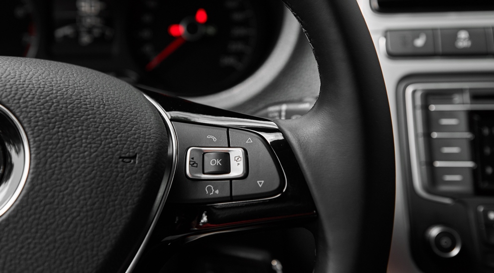 На что мы больше всего обращаем внимание в салоне при первом взгляде? На руль, наверное. И он тут другой, явно общий по форме с таковым на актуальном Golf. Те же кнопочки, тот же обод с удобным хватом, но, как и ранее, баранка кажется слишком большой на фоне узкого приборного щитка.Между спидометром и тахометром – все тот же примитивный сегментарный дисплей, только фон теперь черный, а значки, буквы и цифры – белые, и это глазу куда приятнее, чем былое красное пятно, будто переставленное с папиного калькулятора «Электроника».