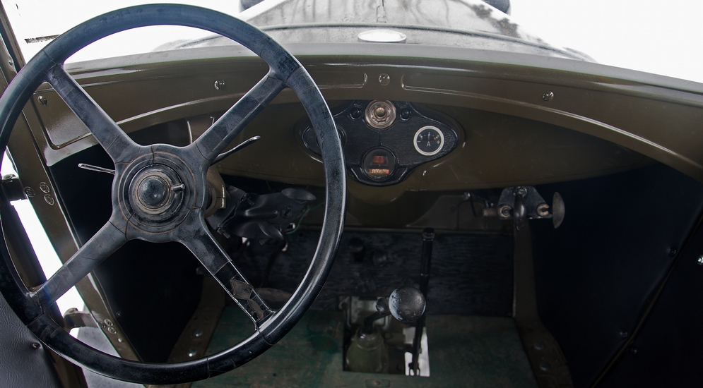 Вспомним матчасть: автомата опережения зажигания на ГАЗ-АА нет, для этого есть рычаг под рулём. Учитывая, что октановое число газа выше, чем бензина, приходится орудовать одновременно заслонками качества и количества газа и бензина в кабине (всего четыре рычага), рычагом фиксированного газа (это уже пятый) и манеткой опережения зажигания (итого – шесть ручек).