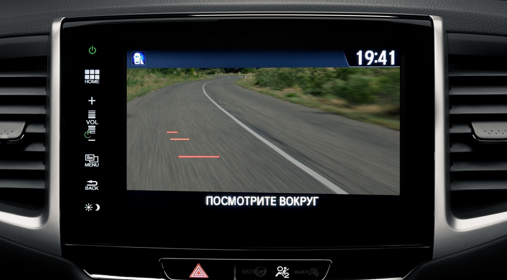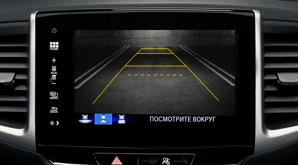 Кресло водителя регулируется в 8 направлениях, так что удобную посадку может настроить себе водитель любого роста, будь то баскетболист или хрупкая маленькая девушка. Отличный обзор вперед. Контролировать дальнюю от себя «слепую» зону можно с помощью встроенной в боковое зеркало камеры высокого разрешения: при указании правого поворота изображение передается на центральный 8-дюймовый экран. Этак и вовсе можно отучиться смотреть в правое зеркало заднего вида... Разумеется, в Honda Pilot установлена и камера заднего вида, у которой есть три режима работы.