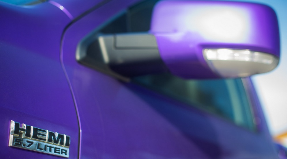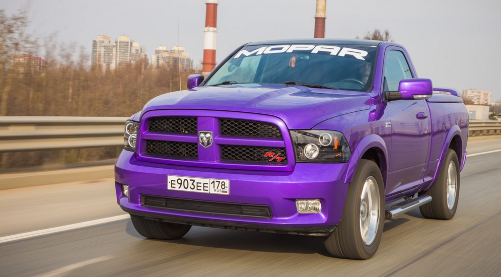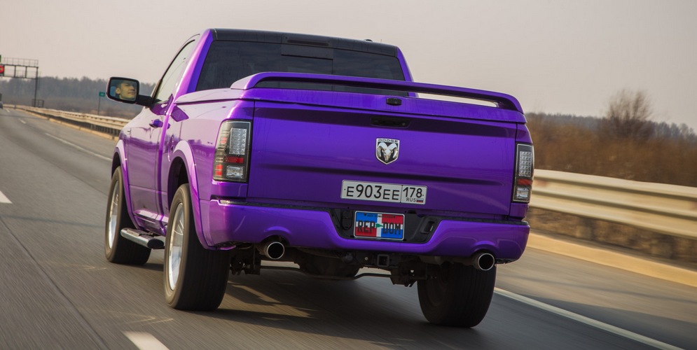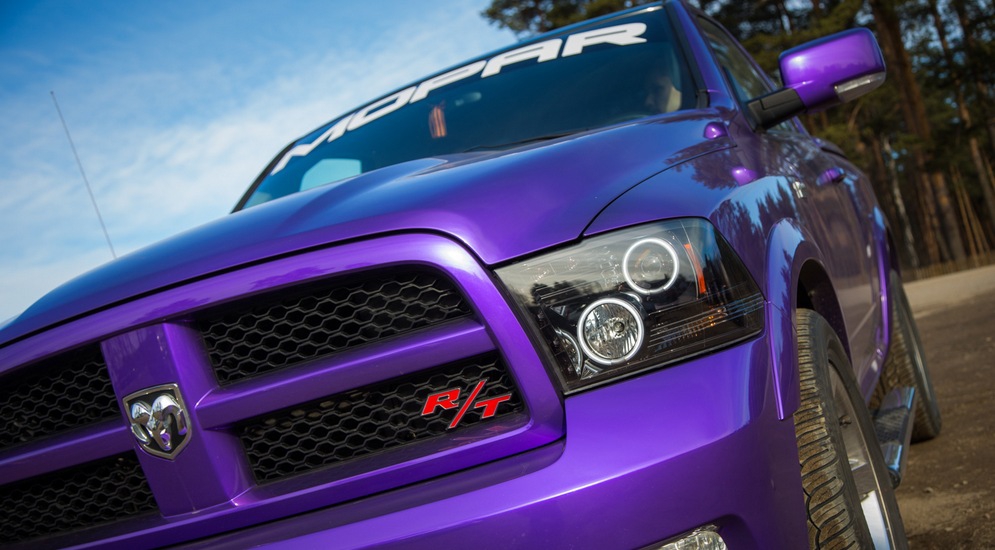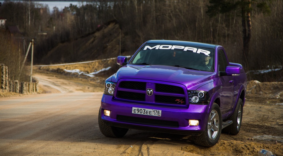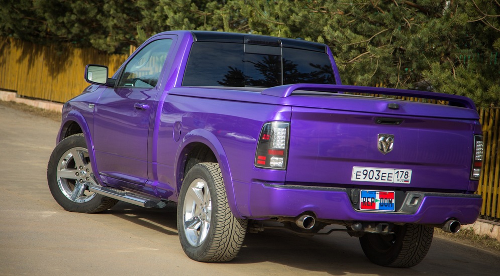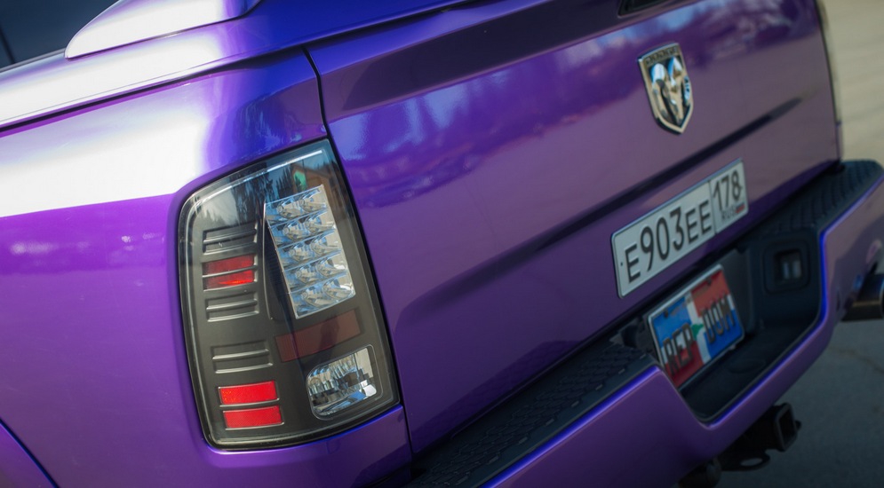 Изначально пикап был белого цвета. Таким он и оставался весь первый год пребывания на российских просторах. Но затем захотелось освежить облик, и машину затянули в фиолетовый винил. Интересный факт: на оклейку всего автомобиля ушло 22 м2 пленки, вполне хватило бы на небольшую комнату. Кстати этот цвет имеет историческую связь с брендом Dodge – в 60-70-х годах в него красили различные маслкары компании, например легендарный Challenger.