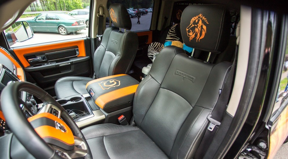 Если бы не автоматические подножки, то забраться в салон можно было бы только при помощи стремянки. Интерьеру пикапа доработок досталось гораздо меньше, но и тут есть чему подивиться. На передней панели, дверях и рулевом колесе обращают на себя внимание вставки из высококачественной оранжевой кожи. Обычно подголовники сидений в Ram украшает вышитая эмблема марки с головой барана, а тут парнокопытные пали под натиском диких кошек, и все четыре подголовника украшают львиные головы. На правах щедрых победителей львы позволили рогатому остаться лишь на ступице рулевого колеса. Довершает преображение интерьера фамильный вензель хозяина авто, вышитый на центральном подлокотнике.Как он едет?