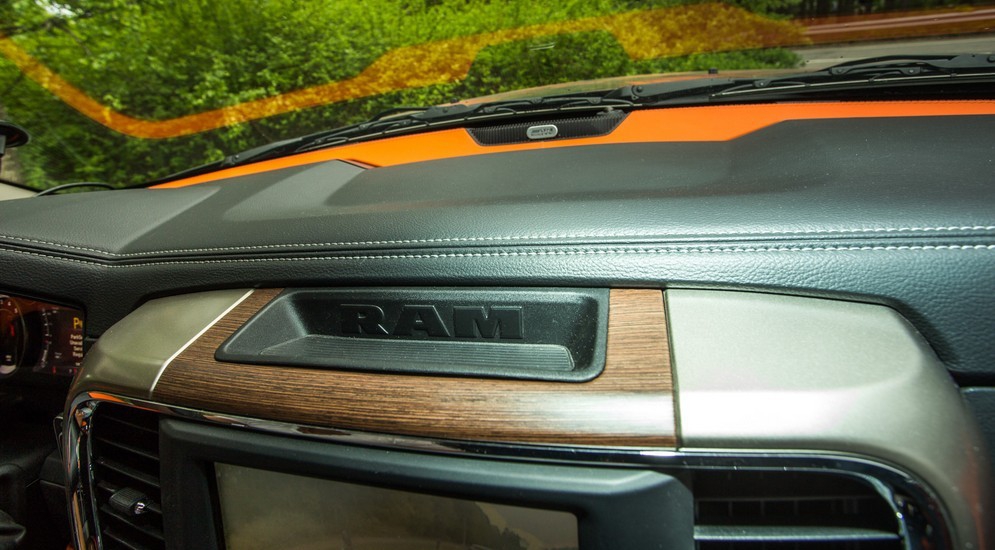 Позаботившись о внешности, не забыли и про салон. Тем более, что пикап Сергею достался в не самой топовой комплектации Laramie. Для переделки интерьера была отобрана оранжевая и черная кожа, по фактуре максимально схожая со штатной. Комбинация этих благородных материалов украсила переднюю панель, центральный подлокотник, вставки дверей и ступицу рулевого колеса. По центру подлокотника и на подголовниках появилась вышивка оранжевыми нитками. По стоимости получилось около 50 тысяч рублей – на общем фоне недорого. Довершила доработку интерьера полная шумоизоляция.Мультимедиа