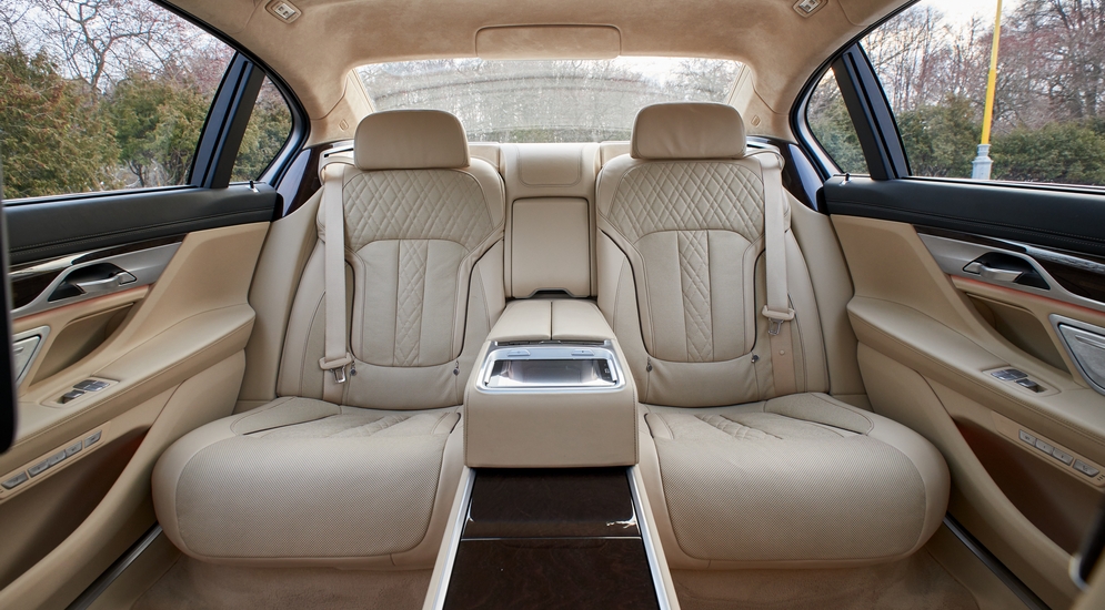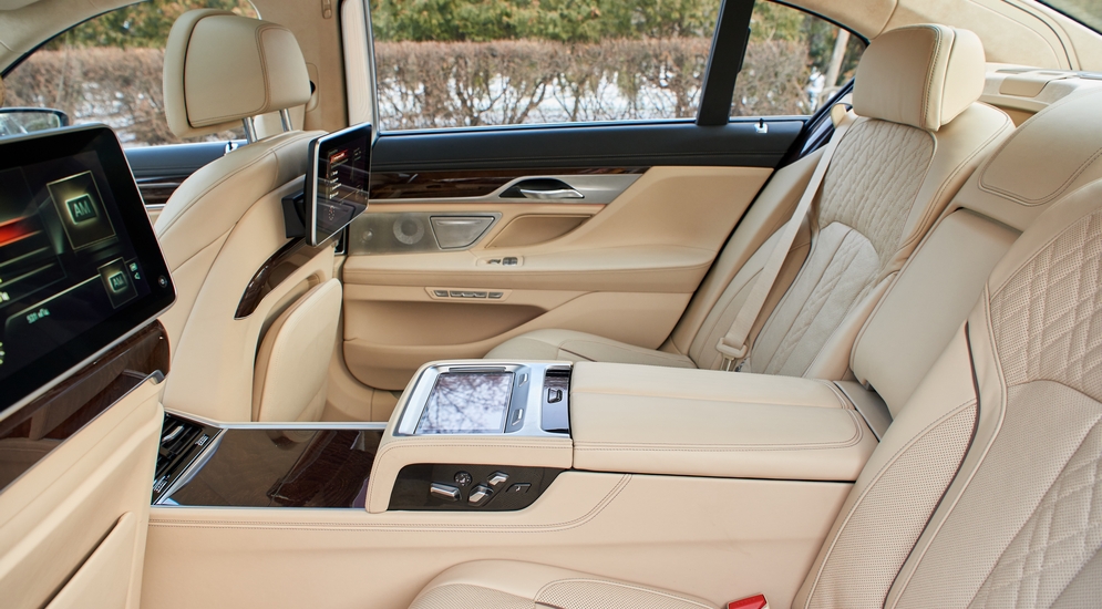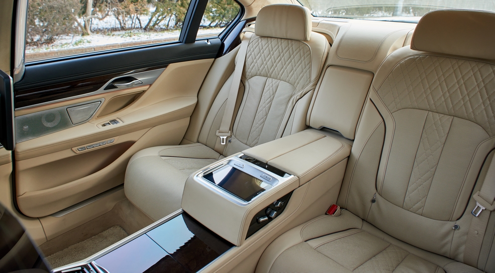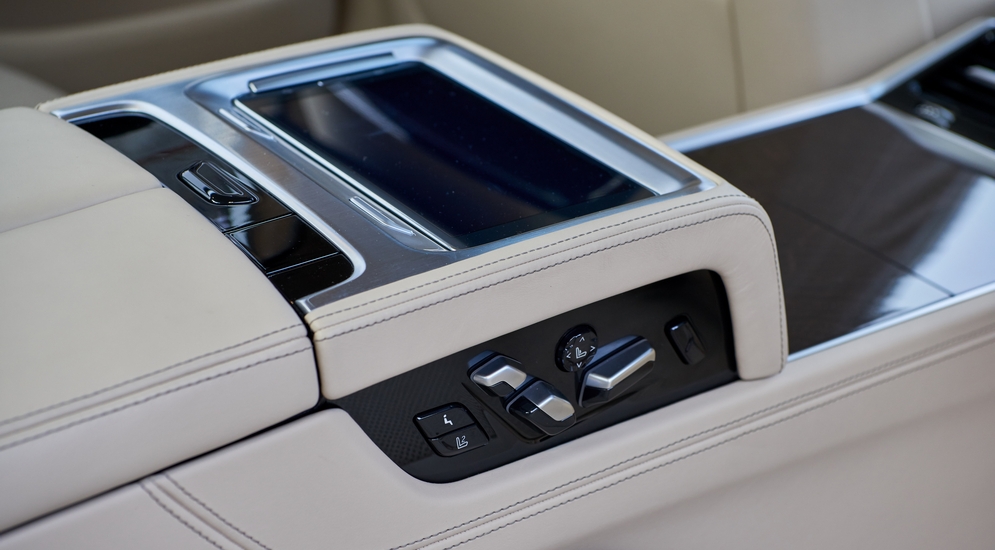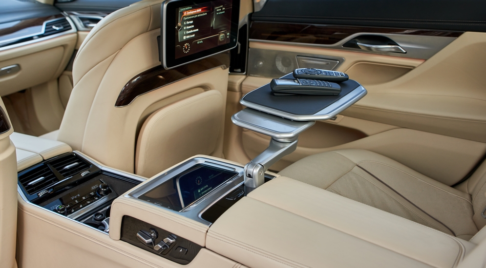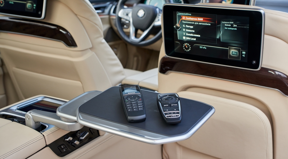 Разумеется, здесь также имеется полный набор люксовых опций: все мыслимые регулировки кресел, к услугам обоих пассажиров массаж (опять же, почему-то только спины – видимо у немцев попы не затекают), раскладной столик, шторки. Однако концепция и философия управления всем этим достоянием «хозяйского хозяйства» разительно отличается от того, что мы видели в Audi. Вместо миллиона кнопок, крутилок, пультов и клавиш в BMW практически все управляется через планшетный компьютер, встроенный в подлокотник.