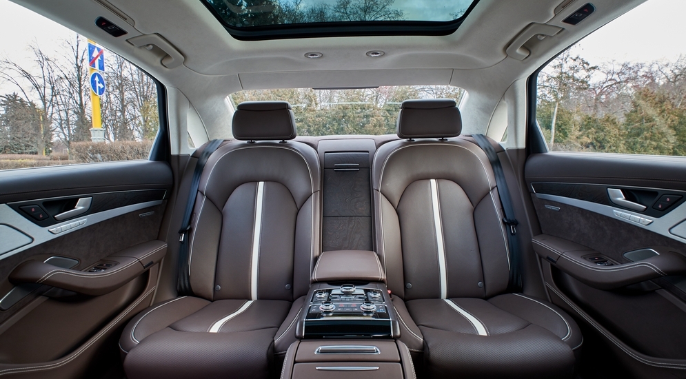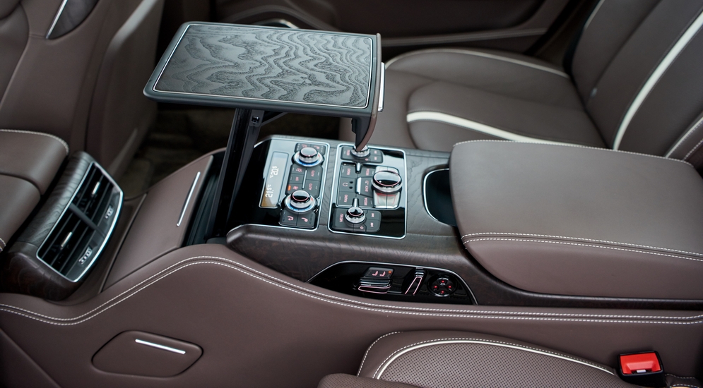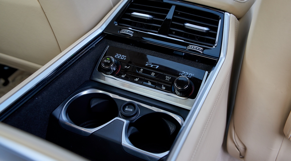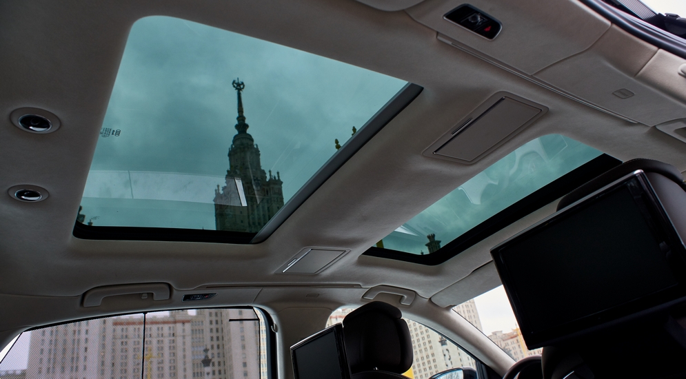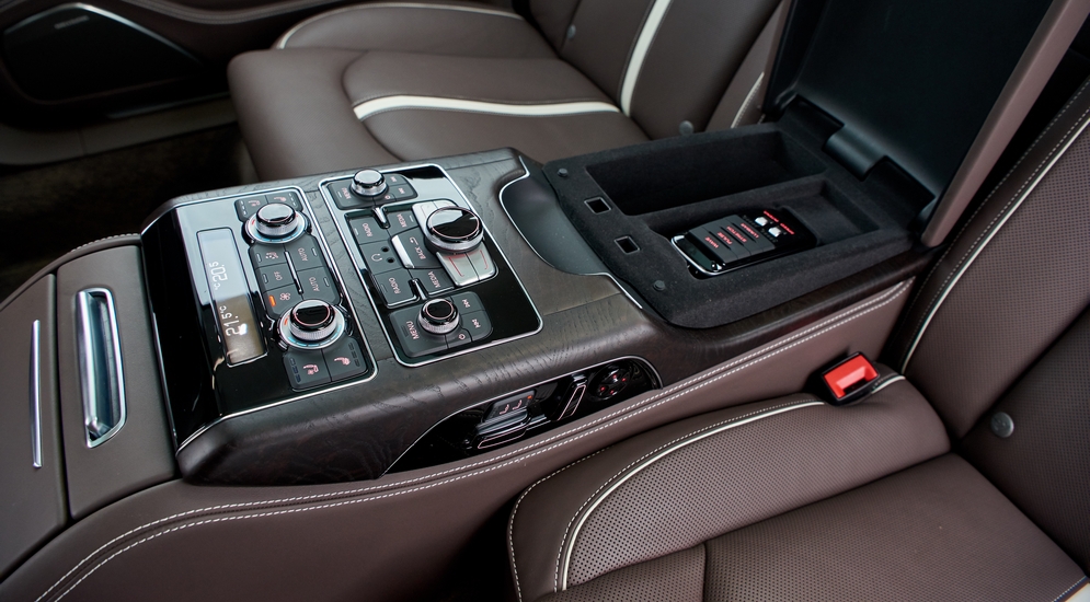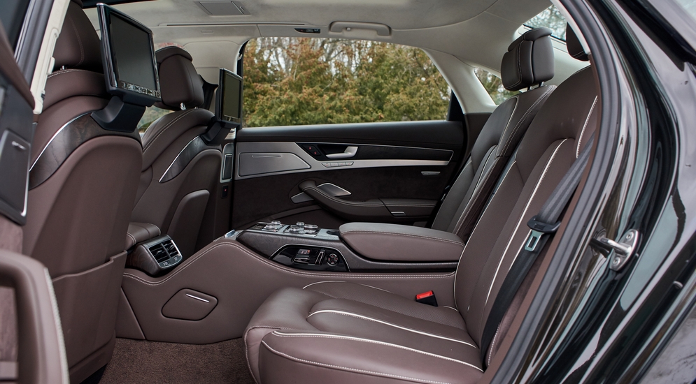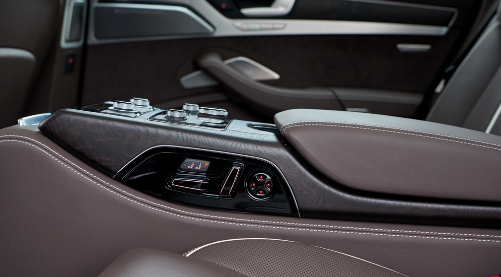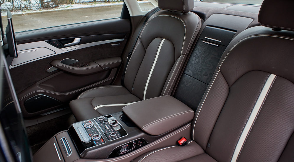 Оба автомобиля, как я уже заметил, представлены в длиннобазном варианте. Оба имеют четырехместную компоновку с двумя раздельными креслами сзади – самый люкс. Audi встречает «теплой» темно-коричневой кожей отделки. Здесь есть все, что должно быть на «хозяйском» месте. Регулировка кресла по вылету и наклону подушки, наклон и изгиб спинки, «спальный» режим, в котором переднее правое кресло уезжает вперед и услужливо откидывает оттоманку, встроенную в спинку переднего сиденья, массаж спины, управление солнечными шторками на всех задних окнах, панель управления климатом (естественно, раздельным для каждого из задних пассажиров) и полноценным блоком управления мультимедийной системой. Она аналогична той, что расположена у водителя, разве что без возможности регулирования функций, влияющих на управление. Разумеется, у каждого из задних пассажиров есть свой ЖК-дисплей с полным набором функций и беспроводные наушники.