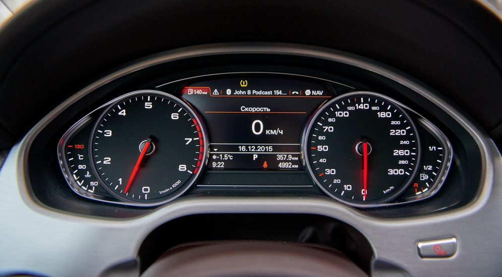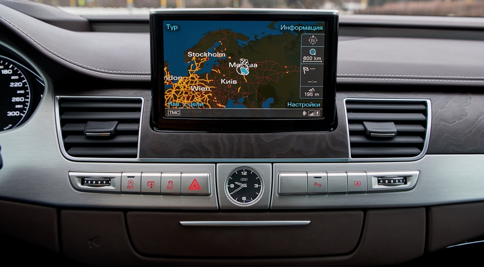 Та же картина – со штатной навигацией. Архаичная графика у Audi, к тому же центральный дисплей между циферблатами (кстати, физическими) отображать полноценную карту не умеет – только направление. Это особенно странно, ведь на А7 точно такая же система MMI на приборке показывает полноценную карту. Вот так номер! Прошивка более старая?