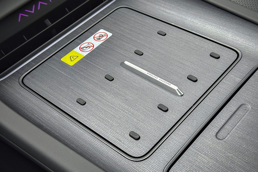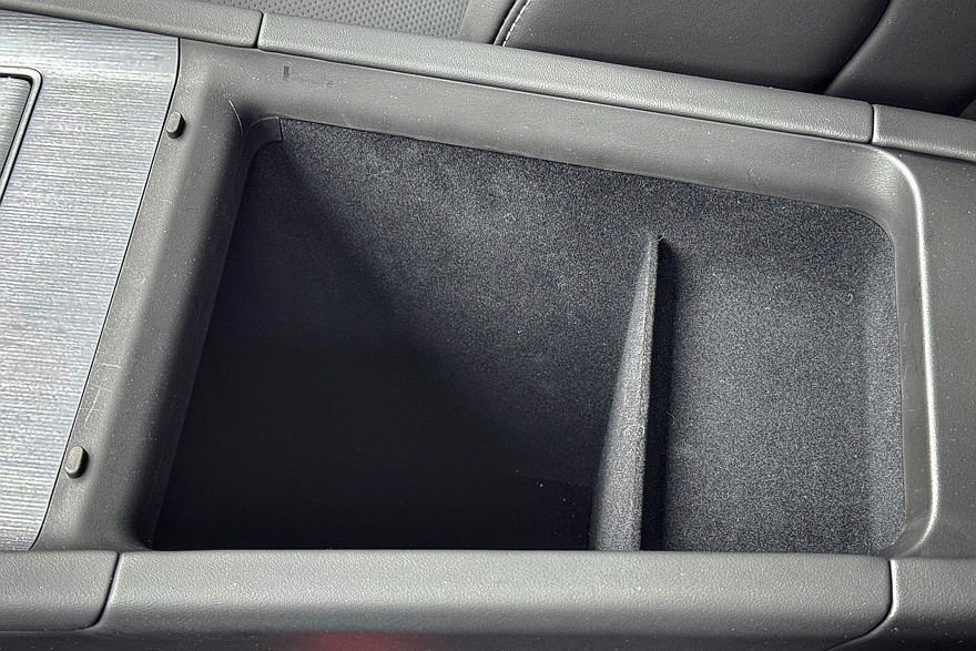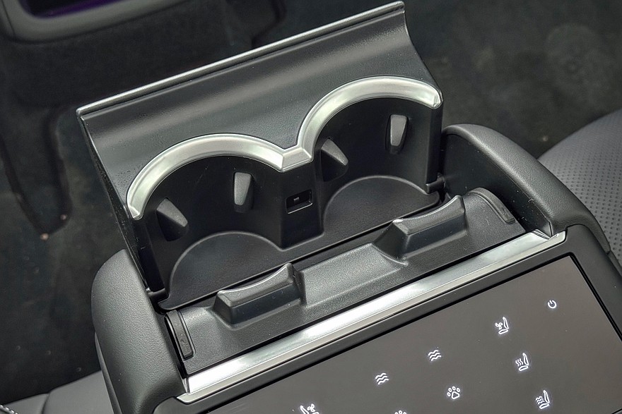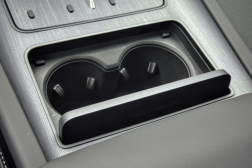 Между передними креслами расположена пара подстаканников, большой отсек в подлокотнике и площадка беспроводной зарядки на два смартфона, которая при работе эффектно опускается вниз, обнажая воздуховоды для охлаждения девайсов. Маленькое шоу ради двух смартфонов – как занавес в театре, поднимающийся ради селфи.
