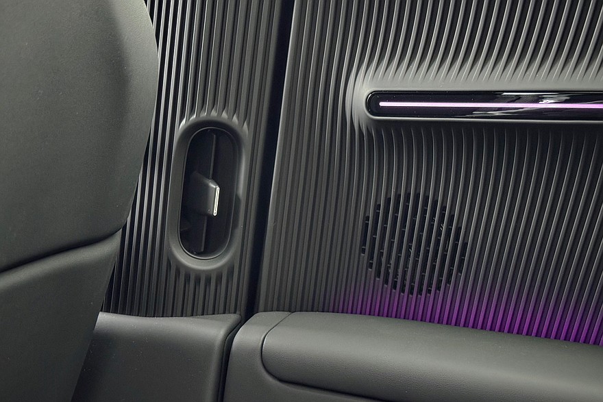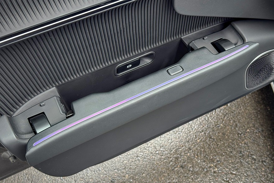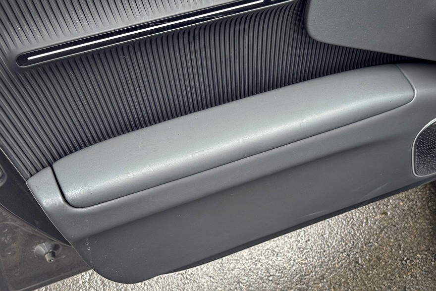 Дверные панели отделаны ребристым прорезиненным полимером – выглядит эта «гребёнка» очень неординарно. В светлое время суток, правда, она похожа на бюджетный пластик, но вечером с контурной подсветкой – другое дело. Под откидными подлокотниками на дверях есть узкие, но глубокие карманы. Качество материалов отделки и сборки – более чем достойное. Кожа нежная, алькантара мягкая – что ещё нужно?