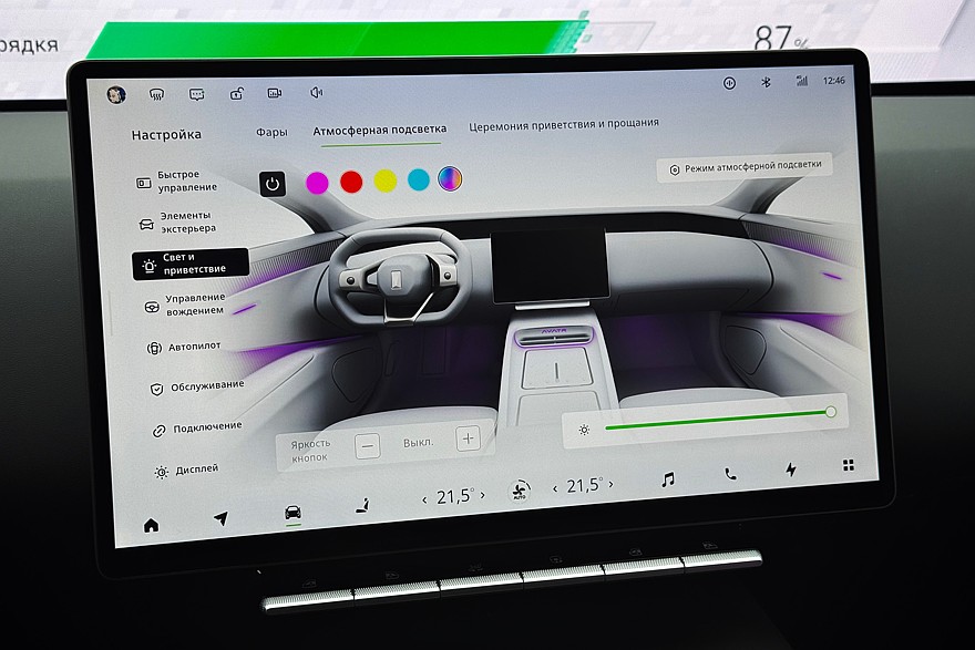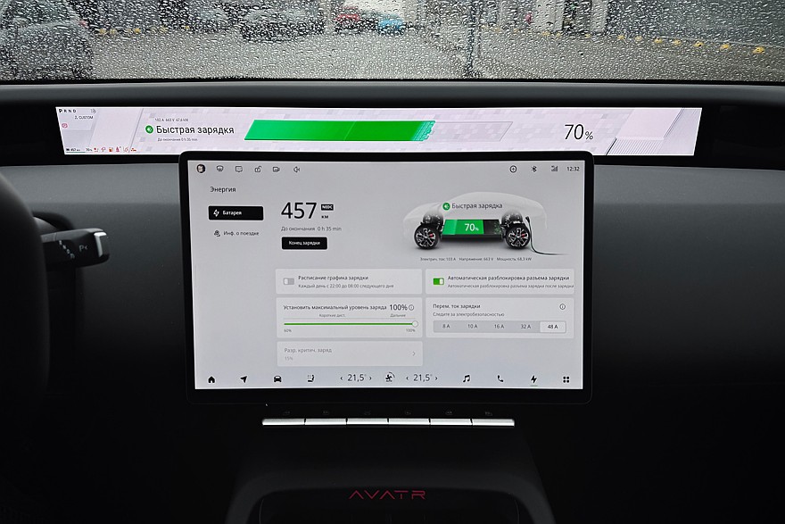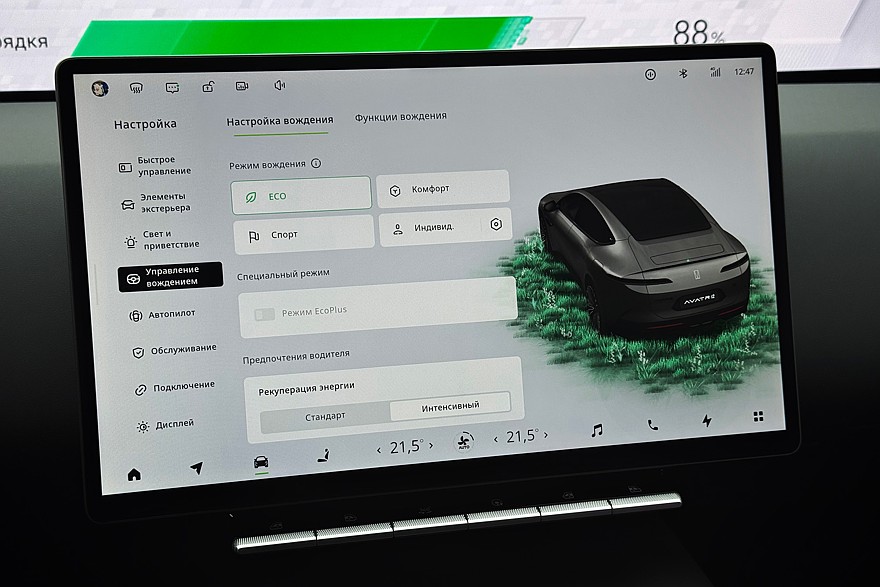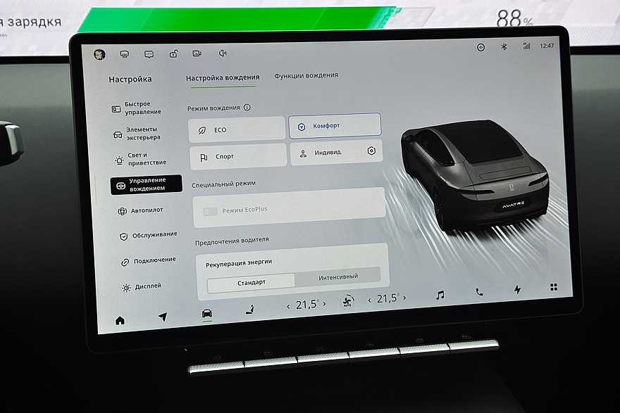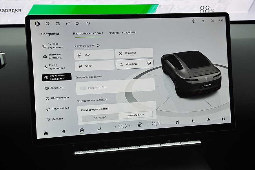 Кроме рядовых «Эко», «Комфорта» и «Спорта», в ездовых режимах Аватра есть «Индивид.», в котором можно настроить все бортовые системы – силовую установку, рулевое управление, подвеску, тормоза – независимо друг от друга, и это здорово. Настроек столько, что можно собрать автомобиль под настроение, как плейлист на вечер. Не грех, например, ускорение оставить в «Спорте», а подвеску – в «Комфорте», потому что даже в самом свирепом режиме 12 трогается с места очень аккуратно, без резкости.