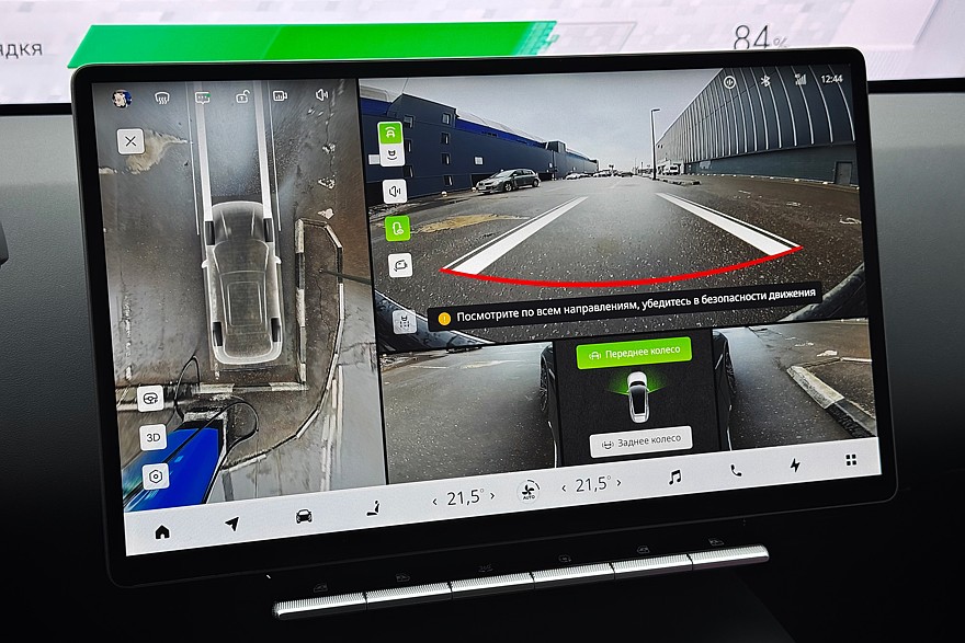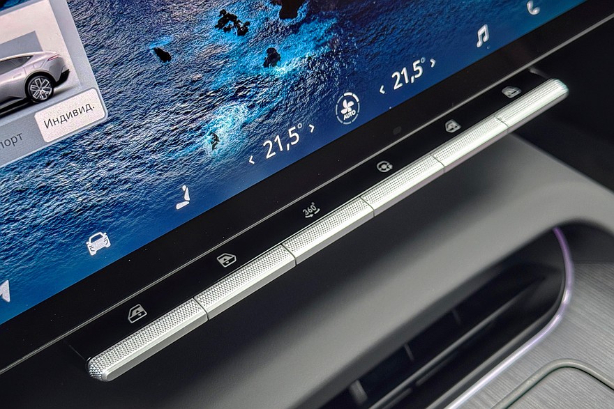 Под планшетом – шесть клавиш с приятной рифлёной поверхностью, четыре из которых внезапно управляют… стеклоподъёмниками (кстати, почему нет авторежима?). Две другие – автопарковщик и система кругового обзора, которую, кстати, можно включить на любой скорости, и она будет работать даже на ходу, пока её не выключишь той же клавишей. Больше кнопок на передней панели и консоли нет, и лишь на потолке притаились «аварийка» и клавиши подсветки салона. Минимализм такой, что кнопки прячутся, как интроверты на вечеринке.