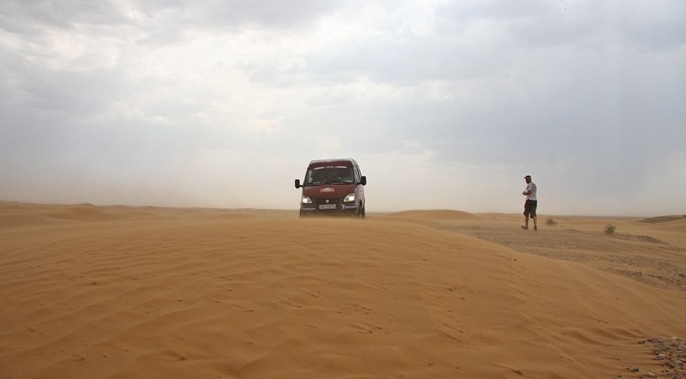 Естественно, на асфальт приходится какая-то часть маршрута, но куда больше здесь песков, пыльных степных грунтовок с неожиданными промоинами и солончака. Пожалуй, не было только бродов. И самым большим сюрпризом оказалось то, что Соболь 4Х4 все это преодолел, не поперхнувшись! За это можно простить многое. Особенно когда видишь, как во время песчаной бури в нескольких метрах от нашей машины коллеги-журналисты умудрились «намертво» засадить подготовленный внедорожник. Или когда приходится вытаскивать «боевую» машину… И все это на привычном стоковом Соболе, обутом в шоссейную резину Michelin Latitude Cross!