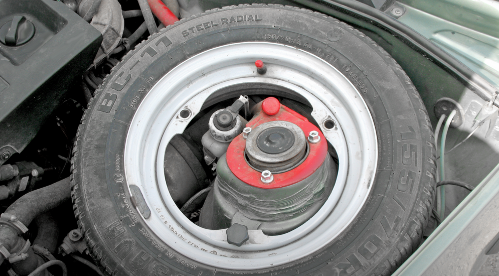 Также перед создателями машины стояла задача убрать запасное колесо из багажника, и тут тоже на руку как раз сыграла его бездисковая конструкция: «запаску» надели на левую чашку подвески под капотом. Правда, позднее оказалось, что при лобовом столкновении это пятое колесо норовит вместе с моторным щитом влезть в салон и травмировать водителя, но в начале 1980-х годов это не было решающим фактором при принятии компоновочных решений.