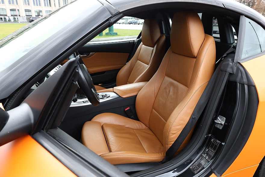 В салоне – светло-коричневая кожа и алюминий. Кресла спортивные, с массой регулировок, включая боковой и поясничный подпоры. Пассажирское кресло имеет все те же регулировки, что и водительское, но без памяти. Толстый спортивный руль оснащен регулировкой по высоте и вылету.
