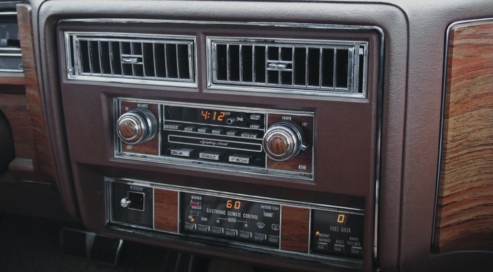 Щиток приборов информативный, через большой руль показания считываются легко. На нашей машине установлены привычные аналоговые приборы с «механическими» стрелками, хотя на топовой комплектации Coupe de Ville могло устанавливаться электронное табло. Но и в нашей версии новаторских для той поры дисплейчиков хватает: бортовой компьютер, климат-контроль, радио с функцией памяти и автоматического поиска, который совсем не по-европейски скачет через одну десятую мегагерца.