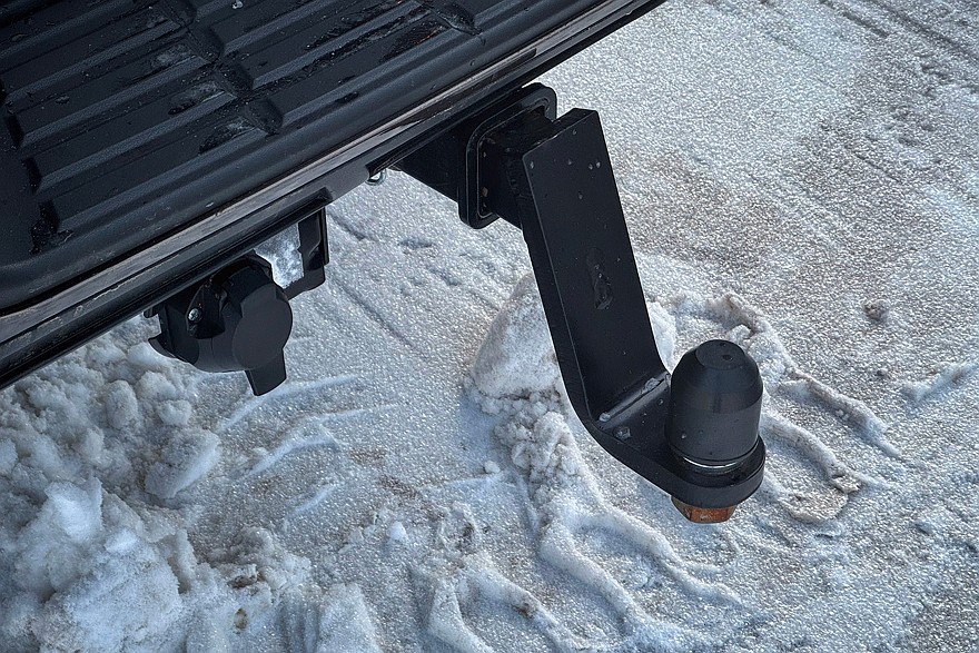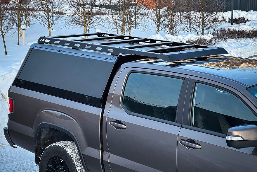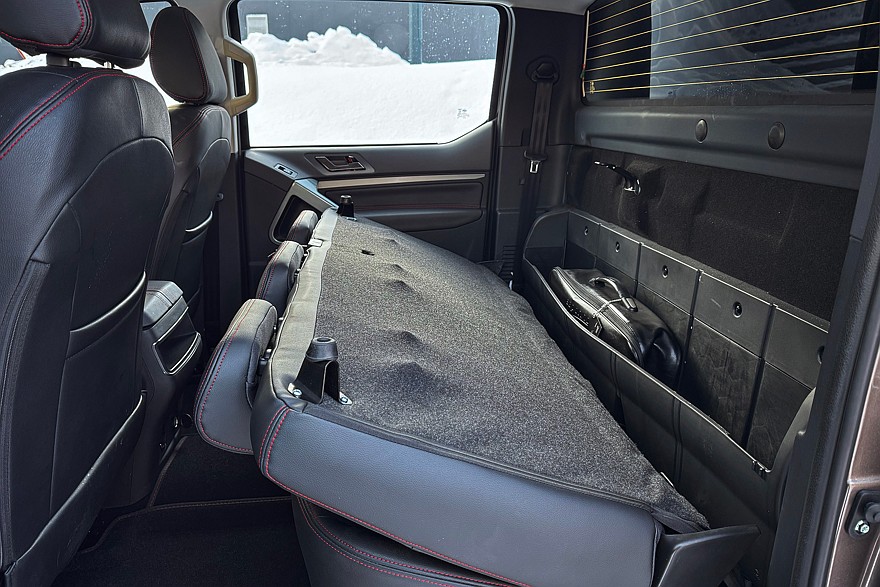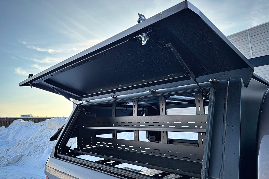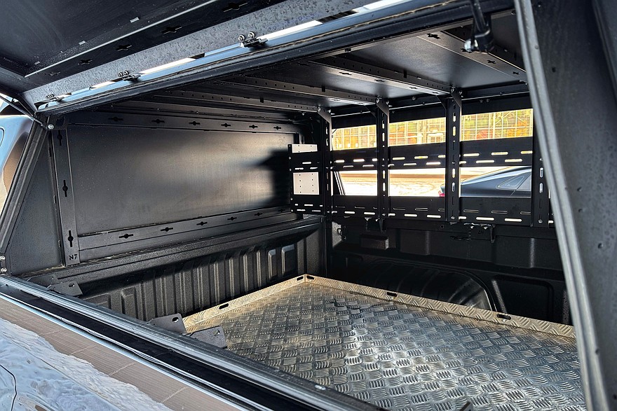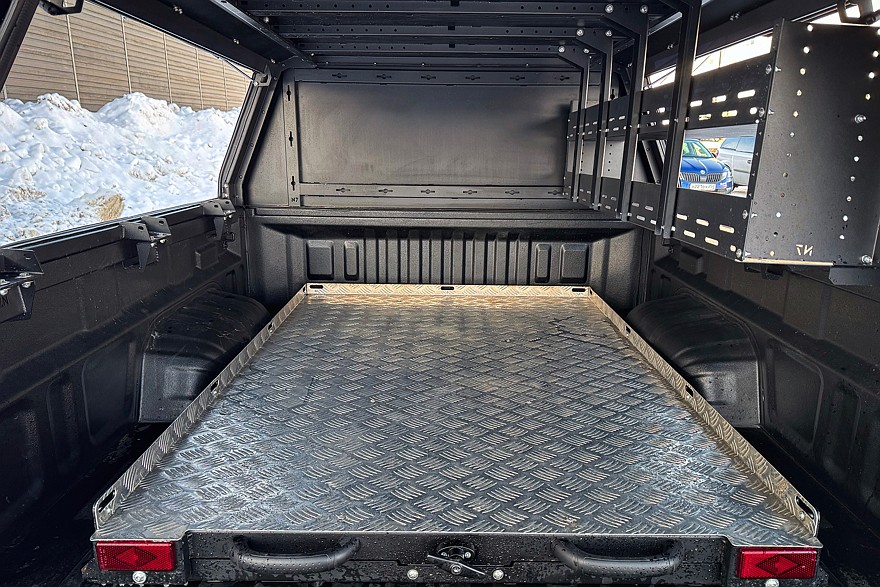 Открывать можно не только заднюю, но и боковые дверцы – с правой стороны прикручены металлические полки, которые можно переставлять как душе угодно. Буквально IKEA на колёсах. Внутри отсека есть небольшой плафон подсветки, створки закрываются на ключ, как и задний борт. На кунге тестовой машины закреплён ещё и мощный багажник, который выдерживает 150 кг. Что важно, все аксессуары, включая фаркоп и даже лебёдку в переднем бампере, вписаны в ОТТС.