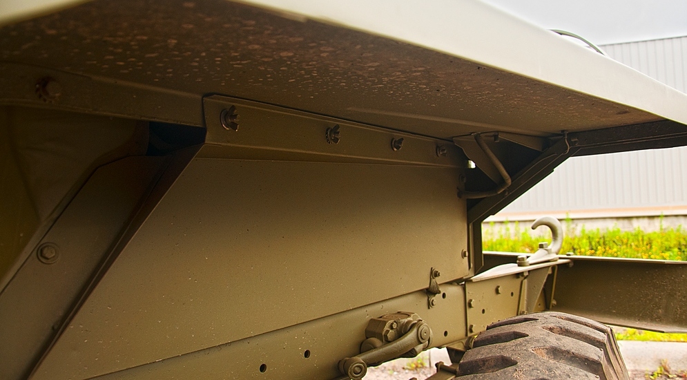 Какие знакомые колёса! А не такие ли покрышки стояли на наших ЗиСах? Такие, угадали. Потому что с резиной у нас всегда было не всё гладко, а в войну – особенно. Почти половина автомобильных шин приходила в Советский Союз по ленд-лизу, и неудивительно, что наши автомобили были обуты в западные «шузы». Идём по кругу дальше. Сразу за кабиной под левым бортом две канистры: одна для запаса воды, другая – бензина. Дотошные американцы даже горловины сделали различными: не перепутаешь. Сам борт меняет свою высоту в зависимости от положения раскладных скамеек в кузове. Если их поднять, они становятся продолжением борта.