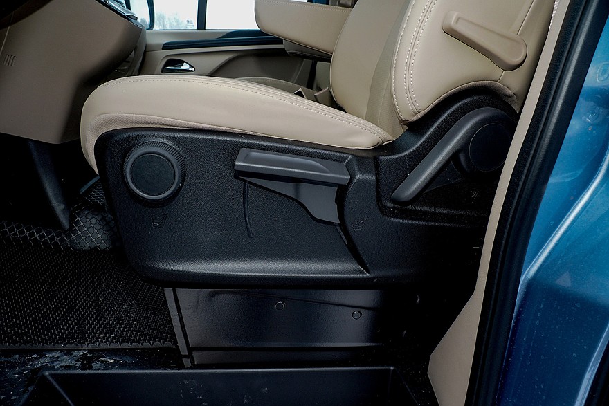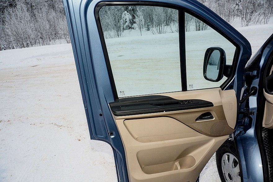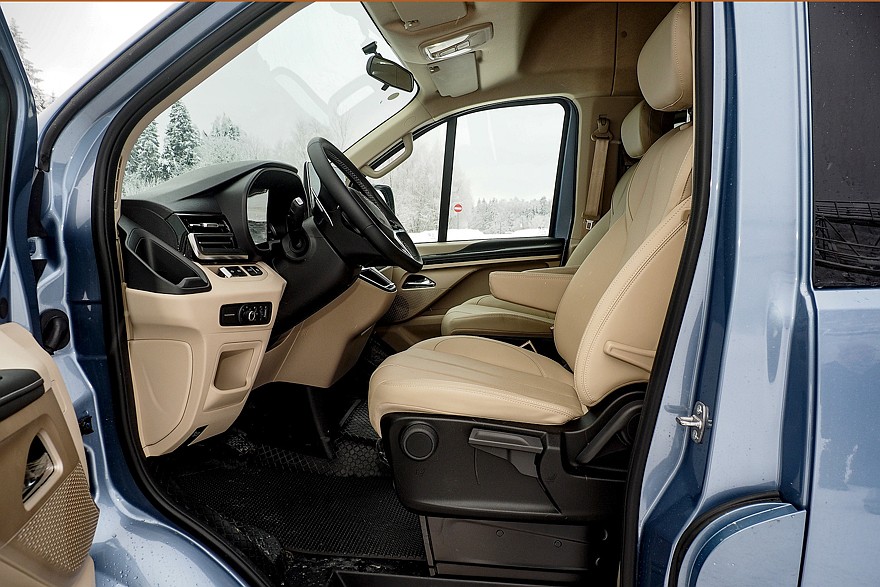 Выглядят Капитаны очень неплохо. Оформление передней части машины получилось не столь футуристическим, как у китайских прототипов, но возможно, это даже хорошо. Даже солидней как-то, а конфигурация бокового остекления с изломом по нижней линии придает силуэту определенную динамику. Доступ в салон осуществляется через четыре двери. Справа и слева – обычные двери, ведущие к сиденьям первого ряда. В основную часть салона попадаешь через сдвижную дверь по правому борту. Сервопривода у этой двери нет – по крайней мере, пока, зато есть автоматически выдвигающаяся подножка. О ее наличии предупреждает трогательная наклейка на стекле двери. Доступ на сиденья задней части салона весьма удобен: проем широкий, в его правой части есть удобная ручка. Все сиденья – «капитанского» типа, с подлокотниками и подголовниками, обтянутые качественной и приятной на ощупь экокожей. Чай, Kapitan, а не боцман какой-нибудь.