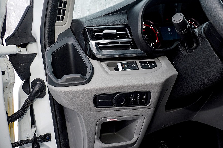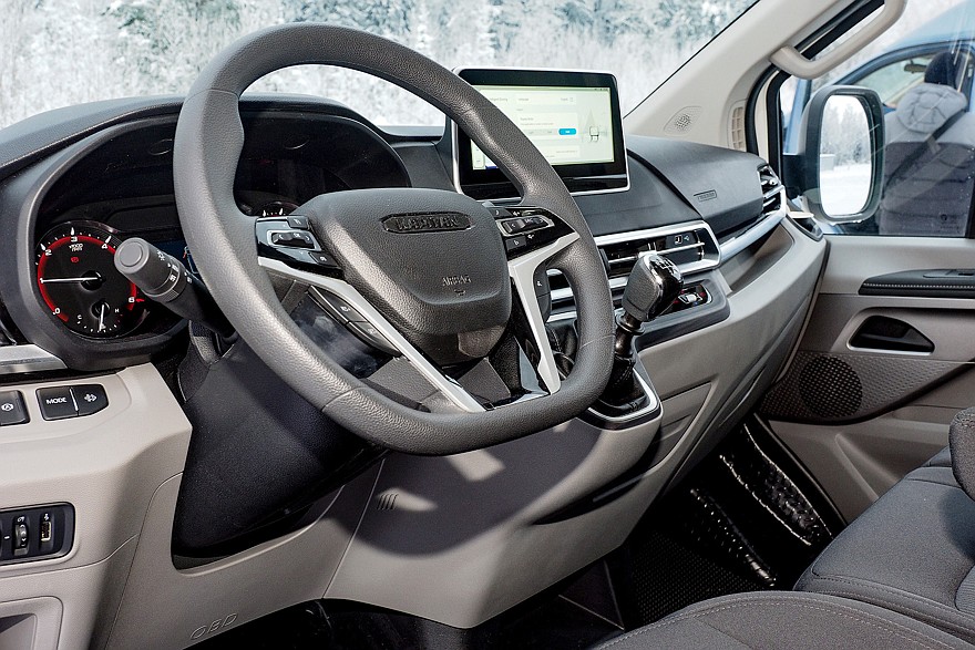 Рабочее место водителя сделано так, чтобы он чувствовал себя не хуже, чем за рулем приличной легковушки. Сиденье с регулировками угла наклона подушки, ее высоты и выраженности поясничного подпора. Обтянутый кожей D-образный мультируль с эргономическими наплывами. Комбинация приборов с цветным дисплеем бортового компьютера. Стояночный тормоз включается клавишей слева от руля. Медиасистема с 12,3-дюймовым тачскрином пока не русифицирована, но на серийных машинах будет устанавливаться, по словам представителей завода, другой вариант.