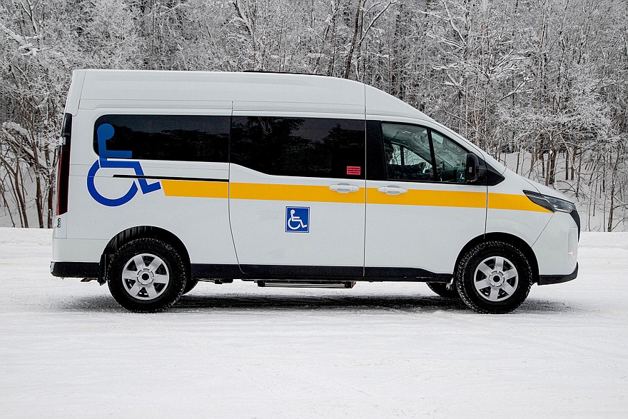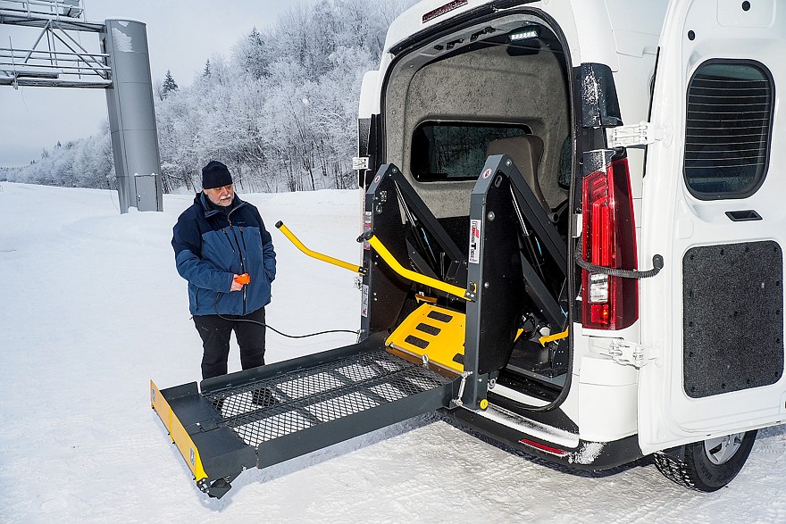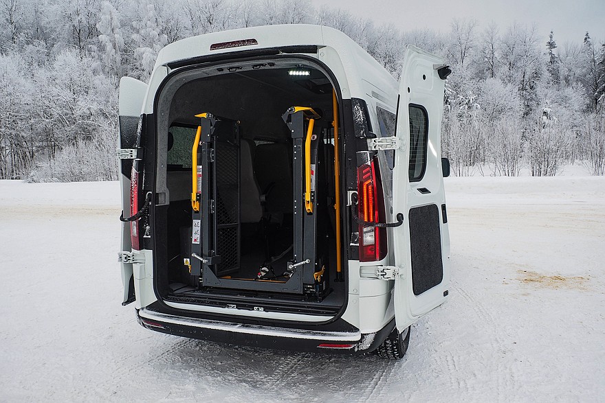 Продемонстрировали нам и то, как будет происходить погрузка в салон маломобильного человека в коляске. Для этого в задней части автомобиля смонтирован специальный подъемник. Чтобы воспользоваться им, водителю придется выйти из автомобиля, скинуть расположенные справа и слева от погрузочной системы стопорные крюки и взять в руки пульт. Когда подъемная платформа опустится на асфальт, человек в коляске сможет самостоятельно заехать на платформу, и оператор поднимет ее в салон. Далее пассажир социального такси может съехать с платформы и пересесть в обычное кресло, а платформа вернется в транспортное положение.