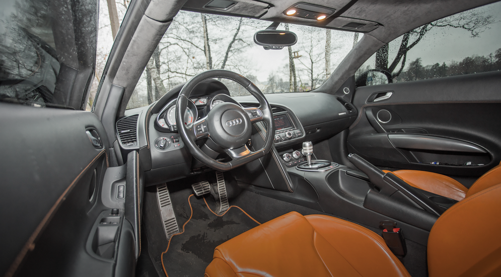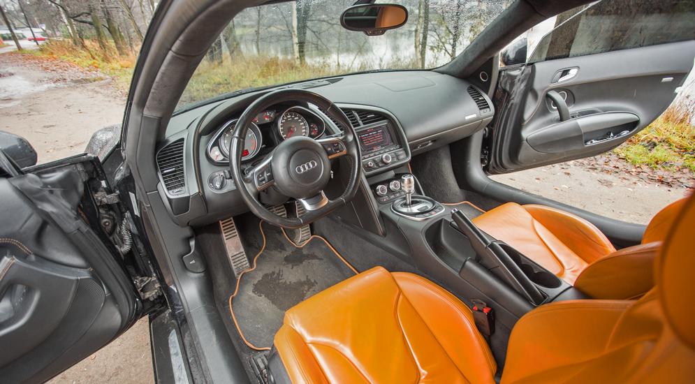 В салоне чуть меньше дизайнерского буйства, чем в экстерьере, но на фоне остальных окольцованных родственников середины двухтысячных это, безусловно, прорыв. Построенный вокруг водителя интерьер абсолютно игнорирует интересы пассажира. Все лучшее – пилоту. Подрезанный снизу спортивный руль, спидометр, размеченный до 350 км/ч, и разбросанные по салону металлические акценты задают спортивный настрой. Кожаная передняя панель, замшевый потолок и опциональная музыка Bang & Olufsen намекают, что ради спортивных достижений необязательно отказывать себе в маленьких удовольствиях.Суперкарам часто сходят с рук эргономические просчеты, недопустимые в других автомобилях. Но Audi, этот оплот немецкого педантизма, даже теоретически не могла выпустить неудобный в повседневной эксплуатации автомобиль. За исключением низкой посадки, R8 воспринимается как нормальный автомобиль. В салоне довольно просторно по всем направлениям. Обшитые рыжей кожей базовые комфортные кресла имеют массу электрорегулировок.
