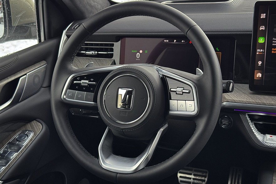 Неудобна, как ни странно, посадка: при внушительном диапазоне регулировок водительского кресла рулевое колесо хочется поднять повыше, поскольку при комфортном положении сиденья оно буквально лежит на коленях. Сам руль неплох – разве что обод тонковат, но спасибо и на том, что он хотя бы круглый. И без сенсорных кнопок. Аналоговых клавиш в Tank традиционно много, что по нынешним временам тоже редкость. Но есть два момента: глянцевые чёрные кнопки бликуют, а на матовых серебристых не видно значков.