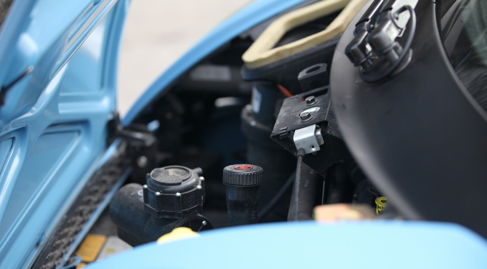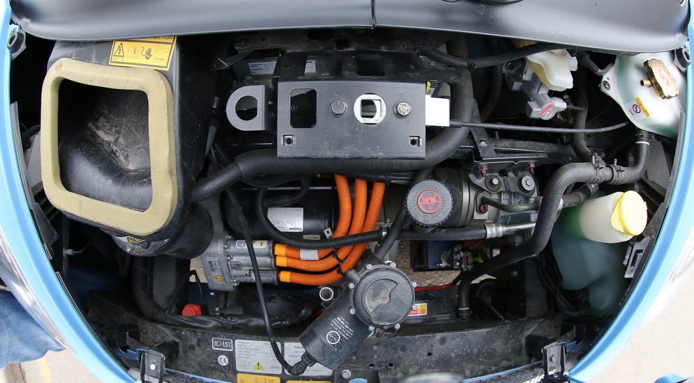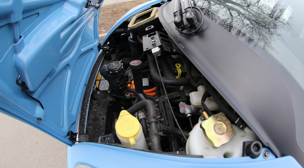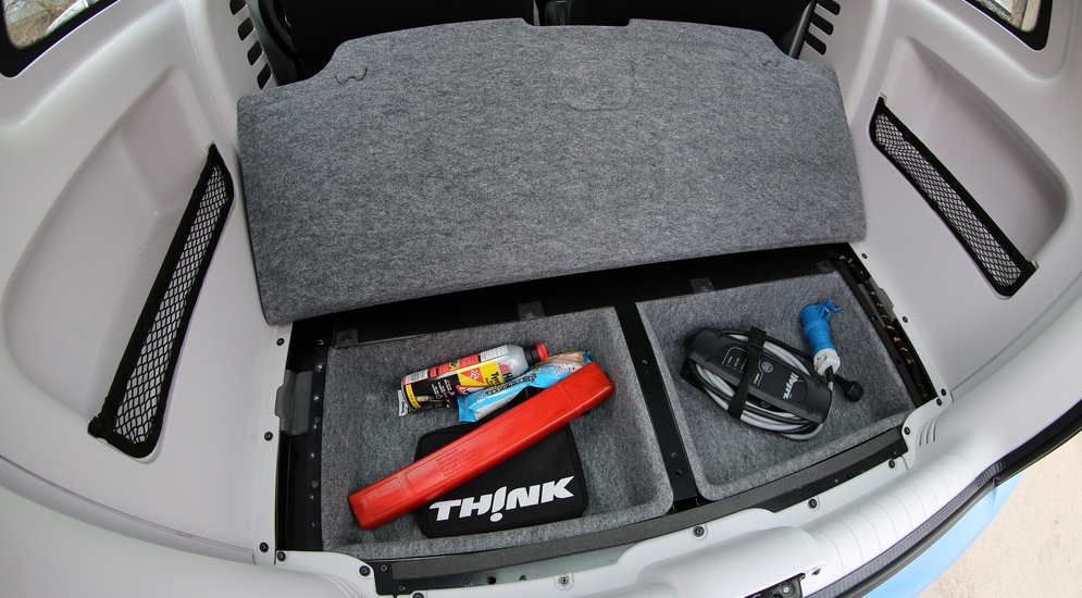 Сквозь колеса проглядывают рычаги передней независимой подвески типа Макферсон и лонжероны пространственной алюминиевой рамы, лежащей в основе машины. Интересный факт: сами амортизаторы на Th!nk позаимствованы с… подвески кабины магистрального тягача DAF XF! Открыв невесомый пластиковый капот, можно заметить только насос гидроусилителя руля, силовые провода, воздухозаборник, через который проходит воздух в отопителе, и вентиляторы системы охлаждения тяговой батареи. Сам электромотор, как и редуктор, играющий роль коробки передач, прячутся в глубине машины от любопытных взглядов. Зато заглянув под днище, можно заметить и тяговую батарею, разместившуюся внутри колесной базы – точнее, её защитный короб, предохраняющий нежное нутро от посягательств извне.