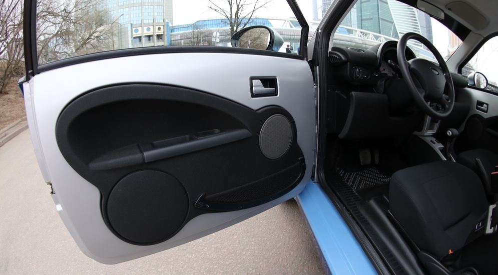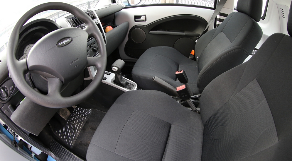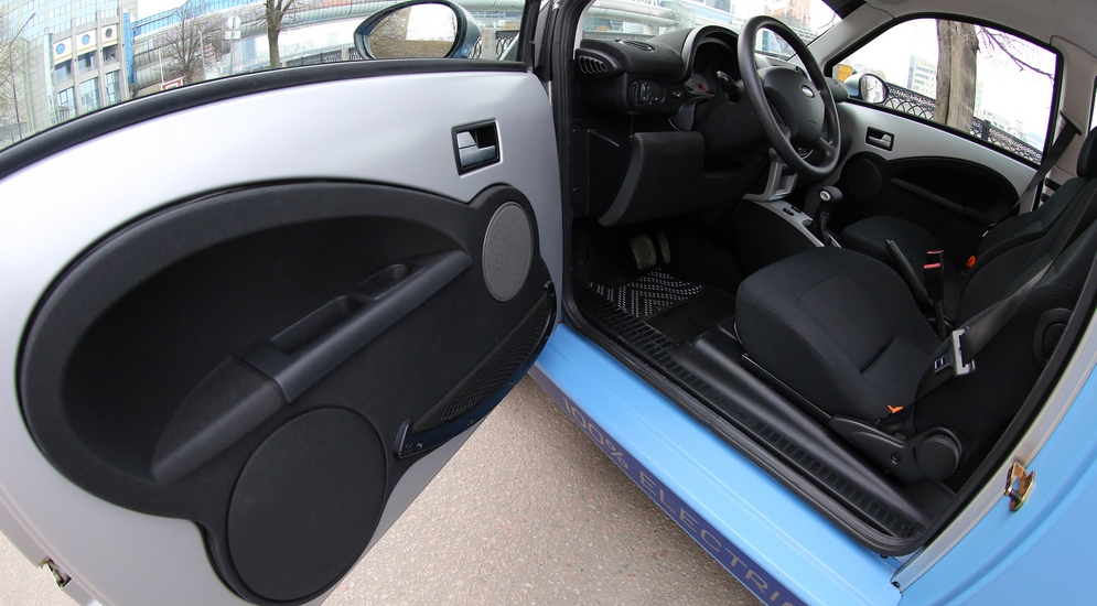 Салон продолжает викторину «угадай, от какого Форда», заданную экстерьером. Рулевое колесо вместе с подрулевым переключателем, например, позаимствовали у Ford Focus первого поколения, а внутренние дверные ручки – у второго. По центру передней панели – гирлянда лампочек, которая информирует владельца о включенной передаче. Рядом с массивным селектором коробки передач разместились откидные подстаканники и клавиши управления электростеклоподъемниками. В штатное оснащение электромобиля, помимо всего прочего, входят центральный замок, обогреватель салона и аудиоподготовка, а в качестве опции производитель предлагал кондиционер, панорамную крышу и продвинутую аудиосистему.