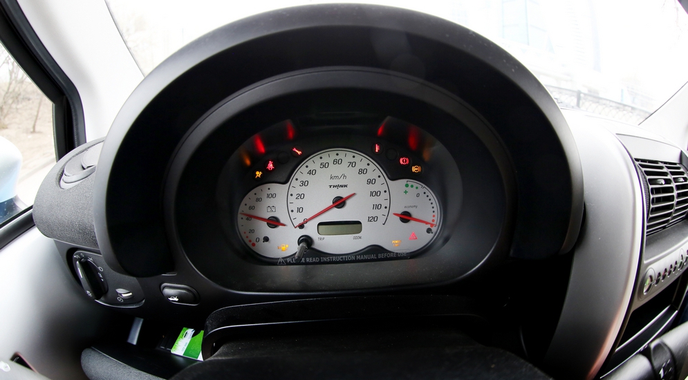 Электромобиль был куплен Алексеем полгода назад в Москве по цене в 1 500 000 рублей. За время эксплуатации счастливый обладатель накатал на своей машине почти 1 350 километров, причем с регулярным постоянством – с начала весны. До этого Think стоял в теплом гараже и эксплуатировался только по выходным дням. С полной разрядки до 100 процентов литий-ионная батарея электромобиля емкостью 70 000 mAh «заправляется» переменным током в 220 вольт за восемь часов. При этом на полную зарядку требуется 24 кВт*ч электроэнергии, что эквивалентно 112 рублям по базовому тарифу на электроэнергию в Москве. Ну или трем литрам ароматного 95-го бензина, если хотите. В зимний период при использовании штатной печки пробег электромобиля уменьшается до 70 км, но в летнее время полностью заряженный автомобиль способен проехать до 140 км на одной «заправке».