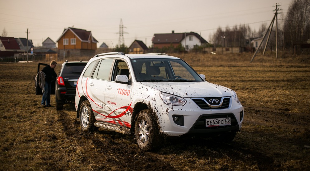 Требовать от двух переднеприводных кроссоверов хоть каких-то подвигов вне асфальта было бы глупо. Поэтому внедорожную вылазку мы даже не планировали. И так понятно, что короткие свесы и высокий клиренс позволят без проблем скакать по бордюрам и смело штурмовать другие асфальтово-городские неровности. Отметим только дополнительно установленные на Тигго пороги – абсолютно лишняя деталь на не очень высоком автомобиле, сильно испортившая ему геометрическую проходимость. Однако в ход теста вмешалась судьба. Путь на наш «деревенский полигон» в пригороде Санкт-Петербурга оказался временно перекрытым, и нам пришлось двигаться в объезд между двумя дачными поселками по слегка раскисшей дороге, на которой Chery Tiggo через полкилометра благополучно и «сел».