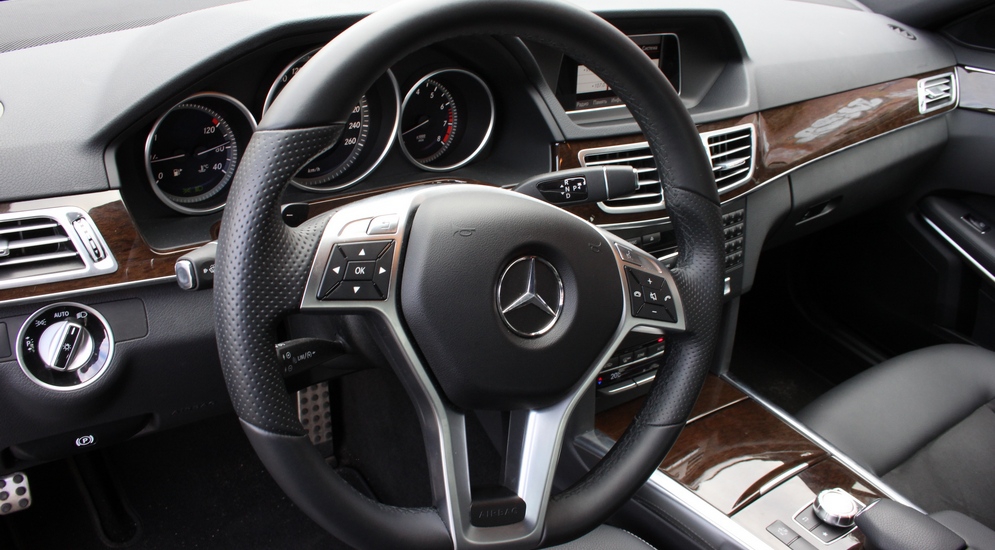 Прямоугольному интерьеру Mercedes-Benz E-class, наоборот, в темном исполнении не хватает домашнего уюта – он чересчур строг. Только когда на улице темнеет, становится заметна подсветка, струящаяся из-под панелей и разбавляющая кабинетную обстановку. Единственный стилистически диссонирующий элемент – маленький подрезанный спортивный руль, входящий в AMG-пакет. В алюминиево-карбоновом окружении он смотрится более уместно.