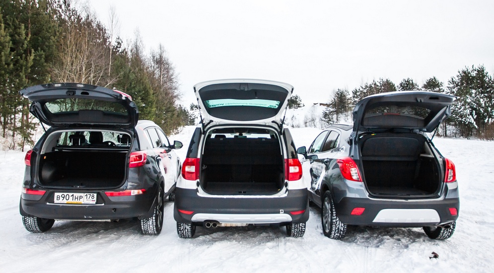 Самый большой багажник предсказуемо у Kia Sportage – 564 литра. Он же – единственный, у кого в подполье полноразмерная «запаска». Грузовой отсек Skoda Yeti объемом 405 литров самый функциональный по трансформации – задние кресла можно не только подвинуть или сложить, но и вовсе вытащить из салона. Самый скромный трюм у Opel Mokka – 362 литра. Его возможностей вполне хватит для городских нужд.