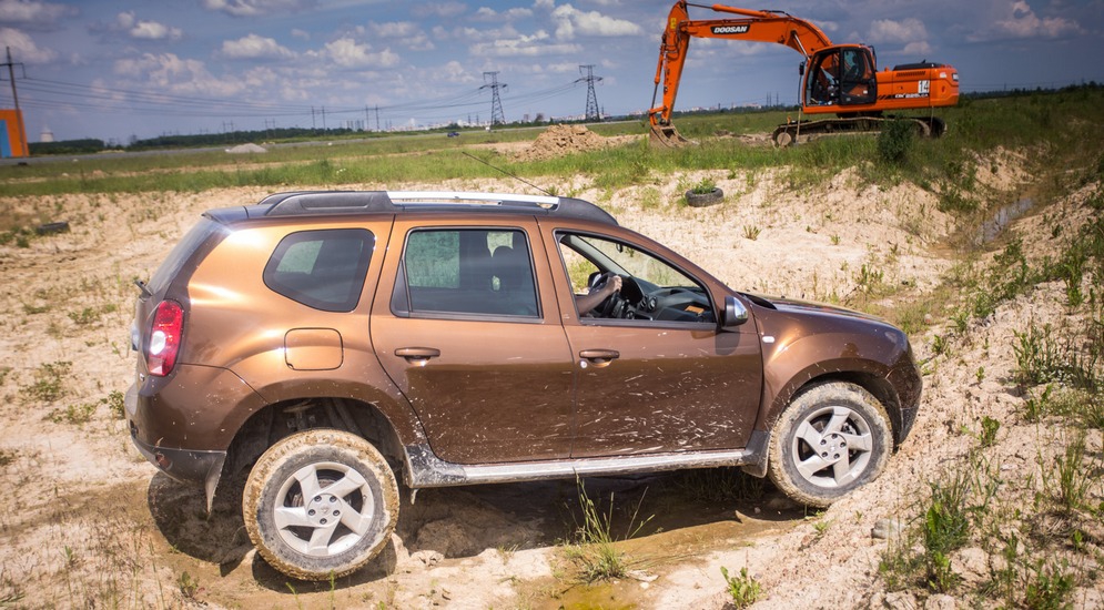 Только вот топить нынешний двухлитровый Дастер оказалось уже негде: болотце, где отлично проверялись внедорожные способности автомобилей... высохло, оставив после себя лишь небольшой грязевой участок. Зато работавшие рядом экскаваторы отсыпали довольно внушительный дренажный канал. Крутейший спуск, грязевой ров и уже высохший, но зыбкий подъем со сложным заросшим травой рельефом на той стороне — прекрасная возможность оторвать кроссоверу бамперы, перегреть муфту и заодно перевернуться! Штурмуем? Само собой!