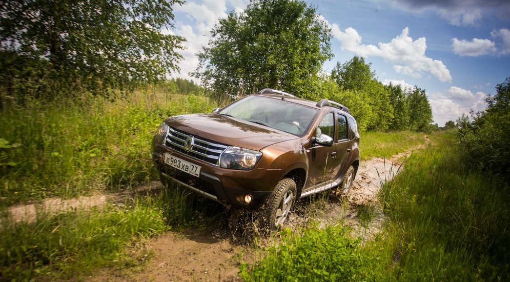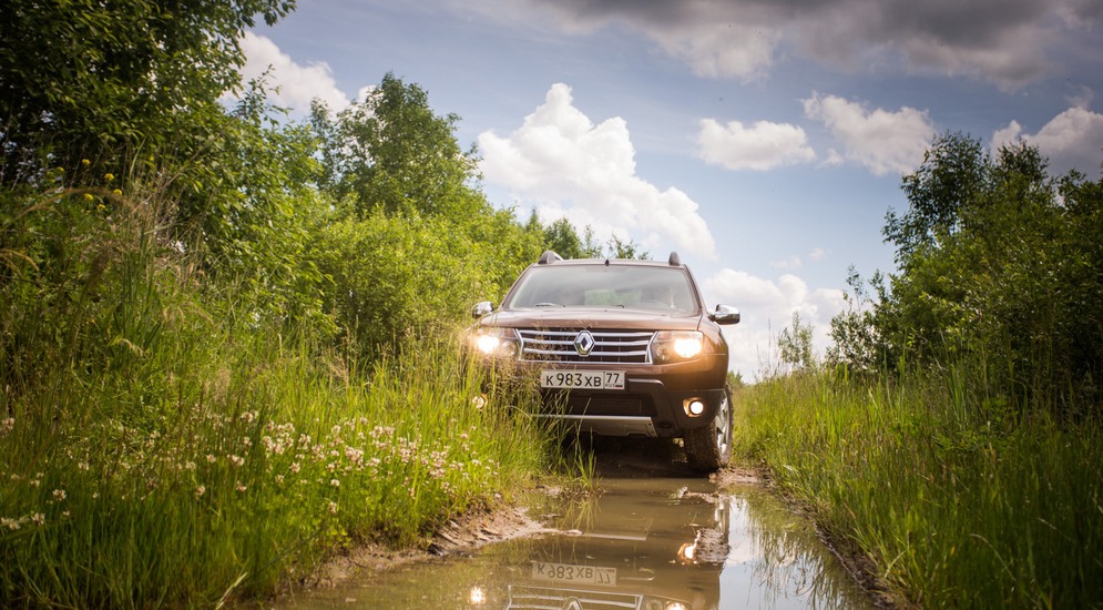 Проезд вот таких довольно глубоких на первый взгляд грязевых канав кроссовер Рено вообще не замечает, собственно, как и водитель. Но опасность есть — не видно глубины, а на дне такой лужи может оказаться большой камень, удар о который придется, например, по рычагам передней подвески. Ещё через несколько километров дорога вывела нас на импровизированный внедорожный полигон, где мы неоднократно проверяли возможности разных кроссоверов в разное время года. Выживают не все: именно тут, например, в мае прошлого года "утонула" Toyota RAV4, а дизельный Duster 1.5 dCi геройствовал в полную силу.